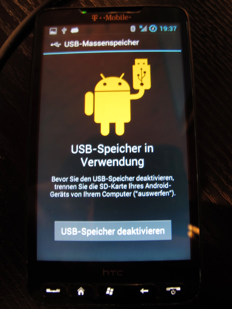 Also das geht doch alles ganz einfach. Das HD2 mit PACman 1.2a ( wobei das aber bei anderen Android Betriebssystemen genauso laeuft ) an den PC und einen USB-Port manuell anschliessen und dann folgende Reihenfolge am HD2 Device einhalten ( sollte der genutzte USB-Port rumzicken, einfach im Geraete-Manager unter Speichervolumes den USB-Port deaktivieren und dann ein paar Sek. spaeter wieder neu aktivieren ):
