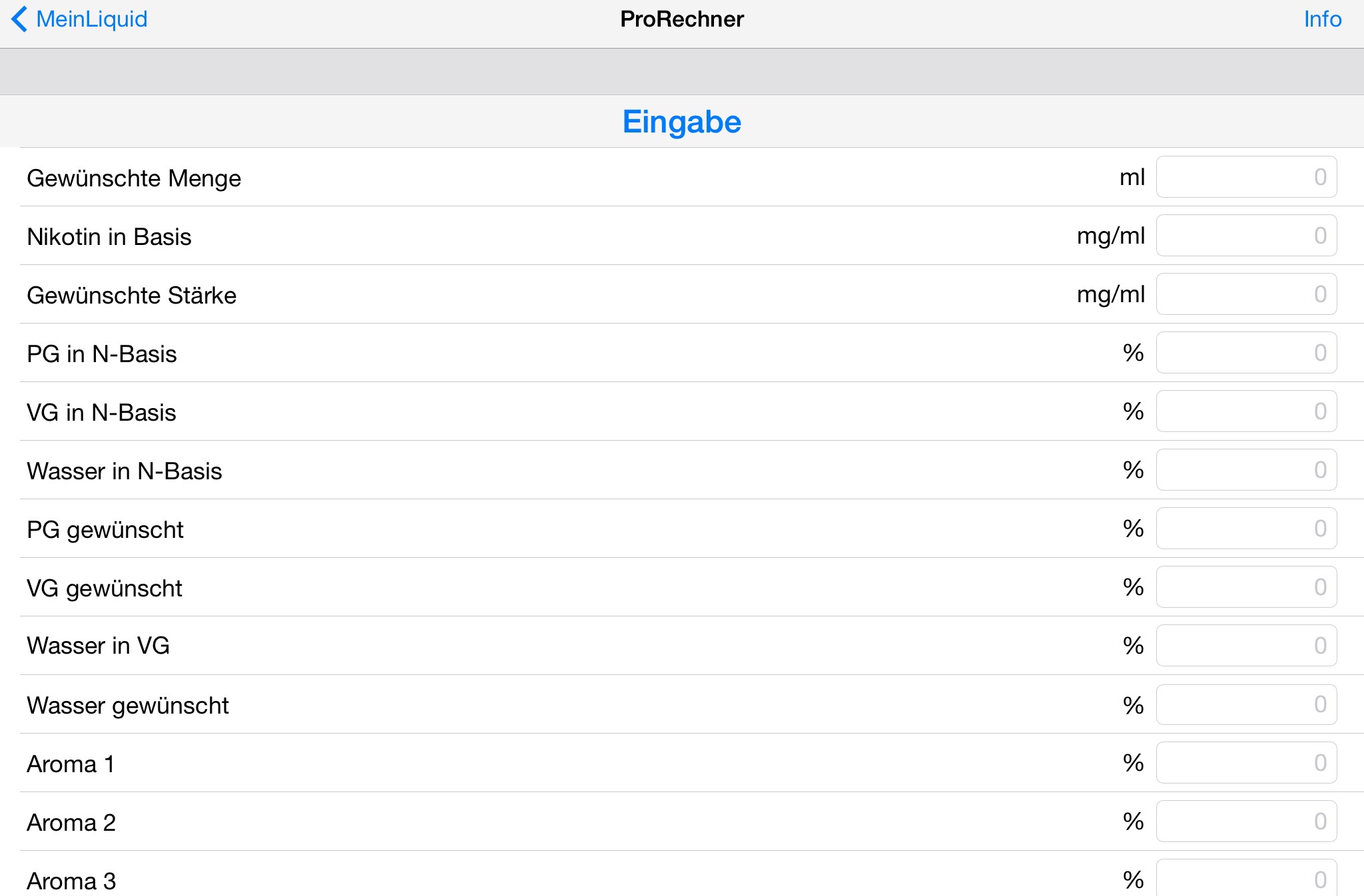 schon sind es 11 Werte, wenn man nur 1 Aroma ber??cksichtigt. OK, beim Aroma k??nnte man davon ausgehen, dass es immer 100% PG sind, das w??rden dann 3 Eingabefelder weniger sein. Es gibt aber scheinbar auch Leute, die ihre Aromen strecken, um sie sp??ter einfacher dosieren zu k??nnen. Dann w??ren diese 3 Angaben ggf. wieder wichtig.