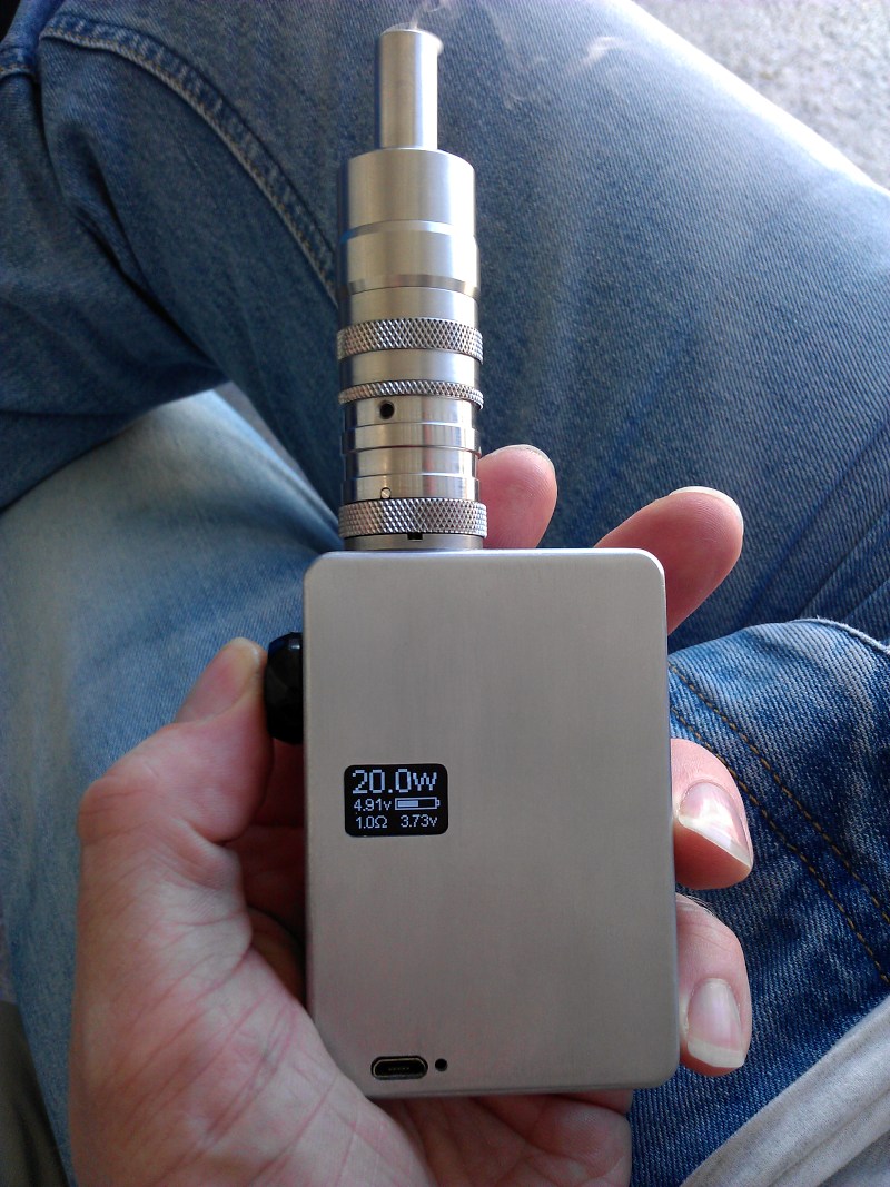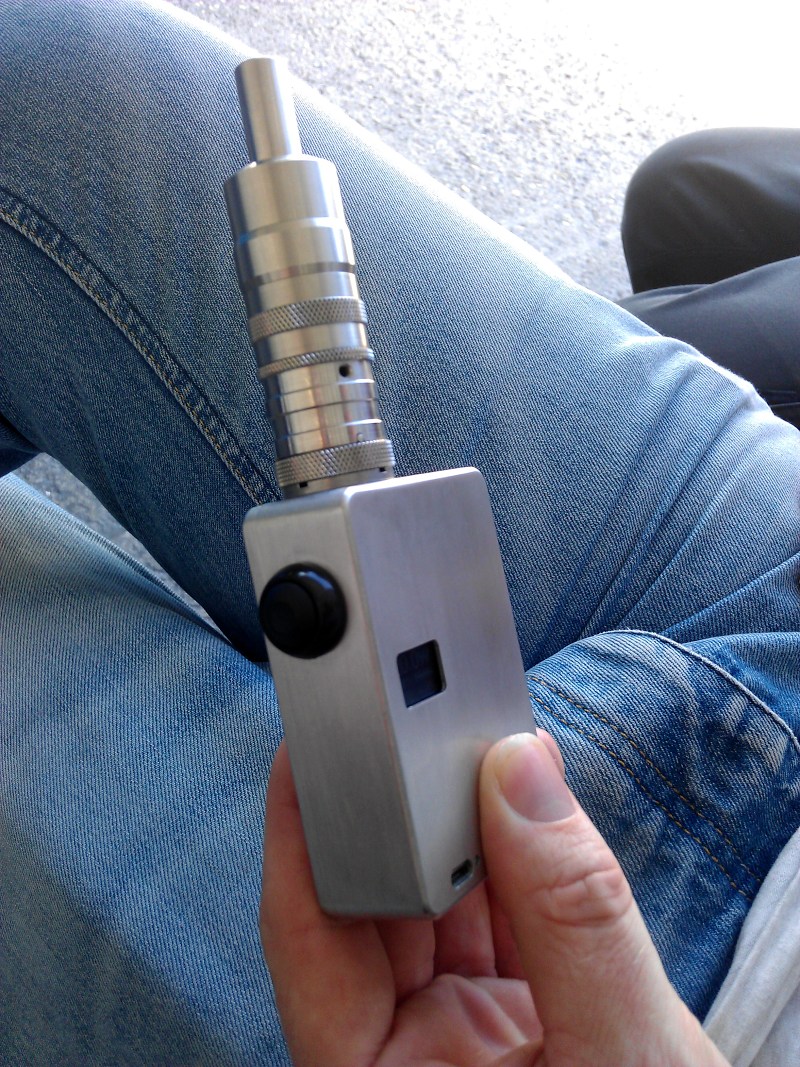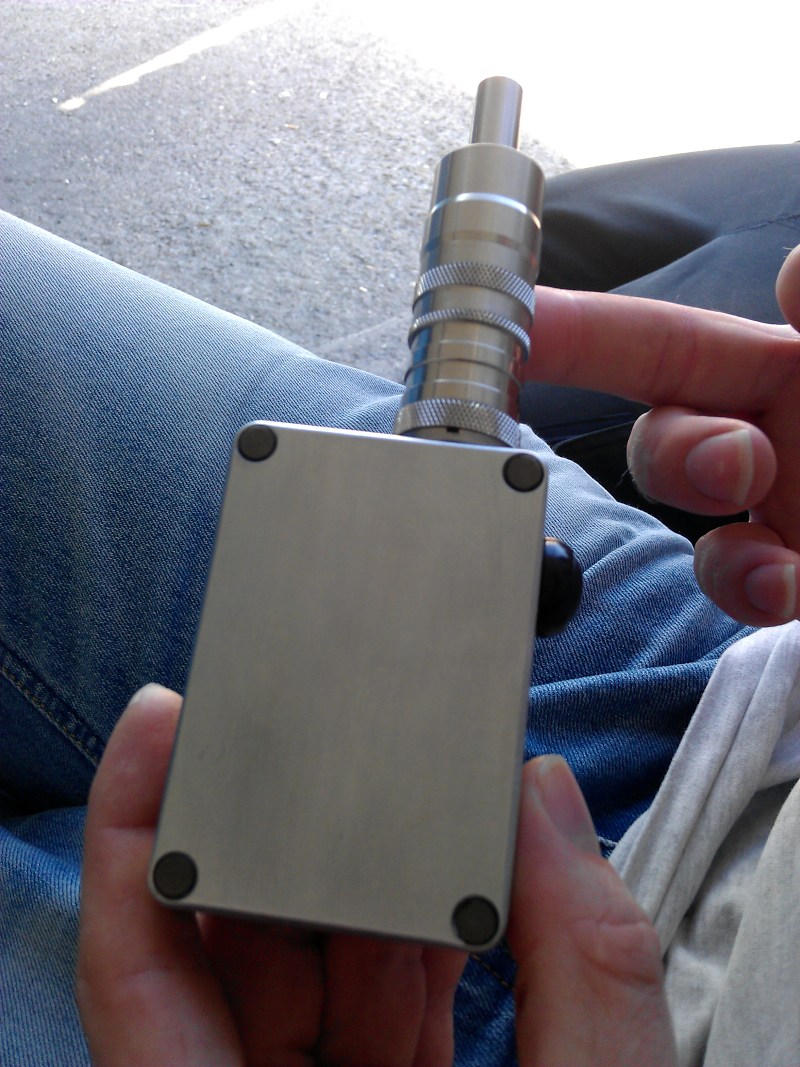 So, wie oben versprochen hier ein paar Bilder seines selbstgebauten SX350 60 Watt Mods...Michael hat geschrieben:Also mein Arbeitskollege hat mir den diese Woche nur gezeigt ( wohl weil der da in seiner Pause noch ein paar Dinge vorbereiten muss....510er und Loecher fuer die Knoepfe ). Ich arbeite ja in einer Firma in der wir Titan verarbeiten und jede Menge Maschinen stehen. Tonnenweise CNC-Automaten; Konventionelle Maschinen; Draht-Erodieren ( uebrigens der 0,25 Draht eignet sich NICHT zum wickeln....da Null Ohm ); Standbohrmaschinen; Stanzen; Laserschneider; Elektrochemische Oberflaechenbahandlungsanlagen; Laser-Gravieren; Anodisieren Typ II....eigentlich alles...Fraggle hat geschrieben:Auch Off Topic: Welchen Akkuhalter von Conrad hast du genommen? Der Keystone Batteriehalter w??rde mich auch interessieren ...wenn du denn hast w??rde mich interessieren ob der sein Geld wert ist (Quali.). Welchen Taster wirst du verbauen? Ich will mir eine (oder gleich 2) Holz Box basteln f??r 2x 18650er parallel (rein mechanisch), habe hier 2 Uralte Teak-Fr??hst??cksbretter gefunden die ich prima verwursten kann.Michael hat geschrieben:Mit dem SX350 Chip baut sich gerade mein Arbeitskollege eine MOD-Box. Alles Zusammen gepuzzelt. Alu-Box und Akkuhalter von Conrad.de; speziellen sehr robusten 510er und anderen Kleinkram direkt in den USA bestellt ( er jammerte bezueglich der enormen Versandkosten aus den Staaten ). Bin mal gespannt wie das ganze fertig aussieht. Die Box ist aber sehr kompakt gehalten. Er meint, da passt alles problemlos rein...DampferFan hat geschrieben:Da der SX350 Chip alleine schon 50euronen kostet, haben Sie wahrscheinlich diese mechanische Version im Programm.