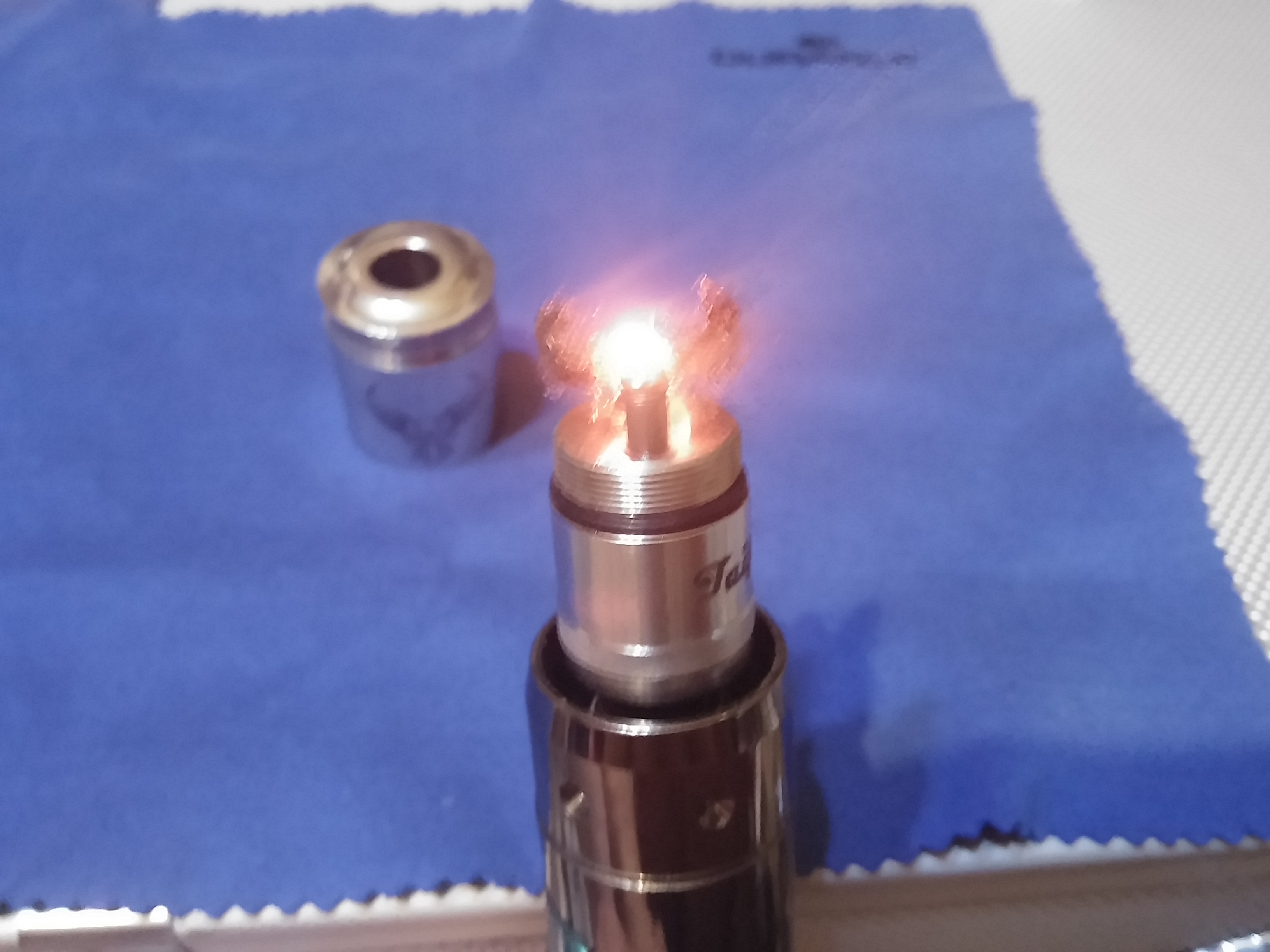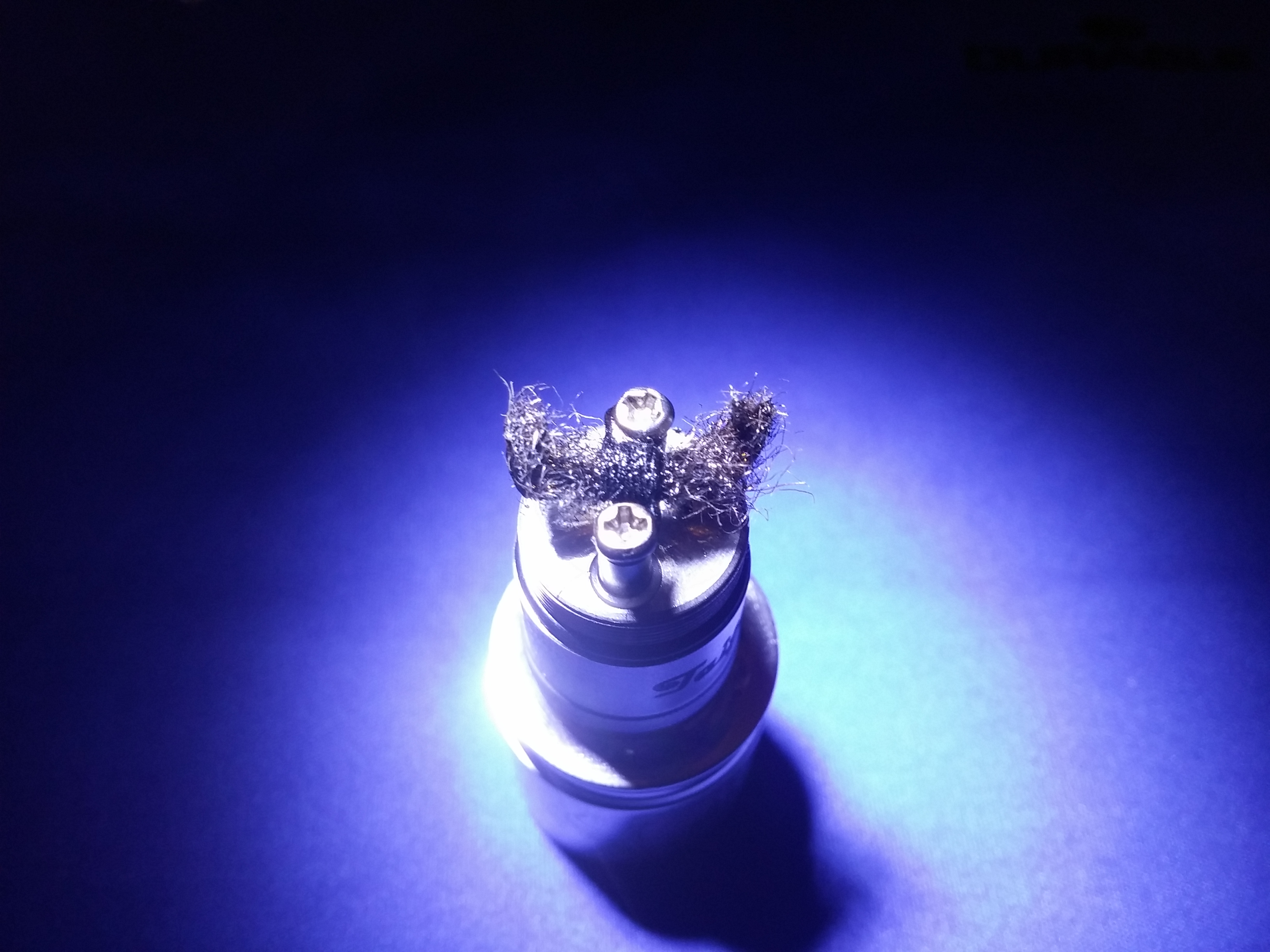 Verdampferhülse drauf, wieder alles schön ausgerichtet, ein wenig Barbque Liquid darauf, Verdampferdeckel mit den ESS dochten