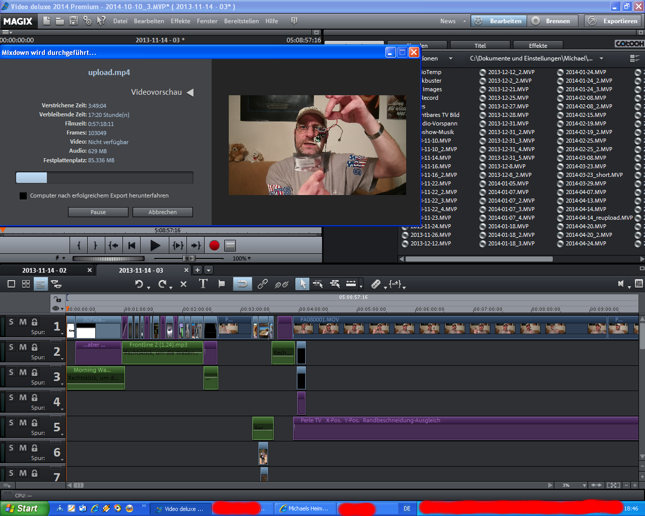 Durch meinen Netzteil-Crash und Neustart ist er derzeit bei Minute 57. Und die dicken Dinger mit vielen Einblendungen etc. ( Rechenintensive Szenen ) kommen erst noch, sodass die angezeigte Zeit-Kalkulation natuerlich sehr optimistische Werte raushaut. Dann muss das 12-13 Gigabyte Monster auch noch hochgeladen werden und YouTube wird wenn alles glatt geht nach dem Upload wohl auch nochmal 10 Stunden an diesem Brocken rumrechnen. Aber schau selbst:Affenritze hat geschrieben:weisst du ungef??hr wann das Video online ist mfg