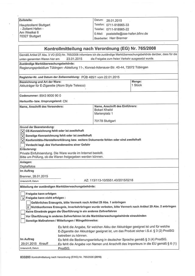 Ich glaube, wenn der Zoll es darauf abgesehen hat irgendwelchen Dampfkrempel abzufangen, findet sich schon die notwendige Vorschrift um das zu begründen