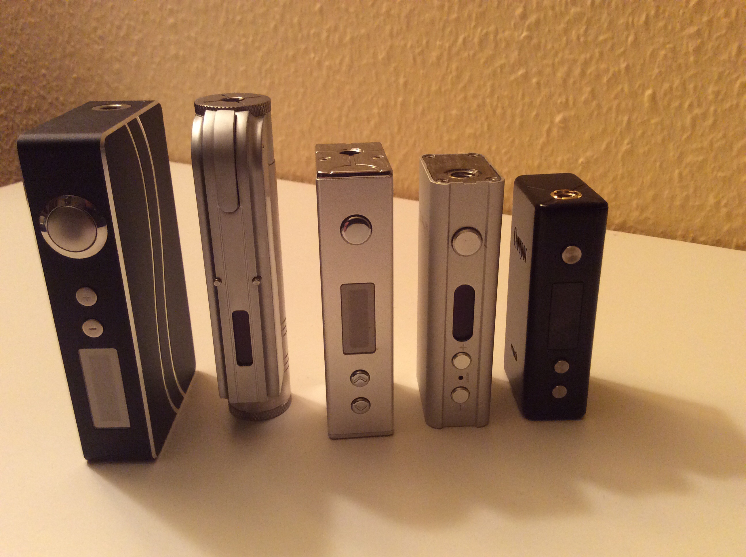 Von Links nach Rechts: Sigelei 100W Plus, ZNA 30, Sigelei Mini 30W, Smok XPro M65, Cloupor Mini