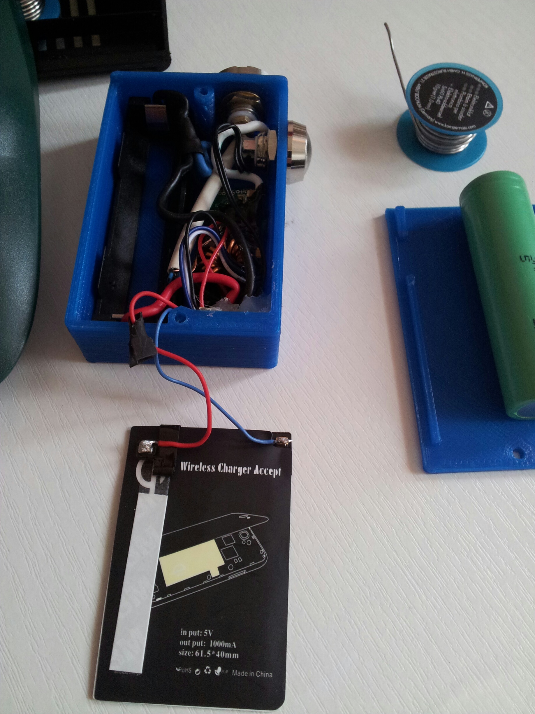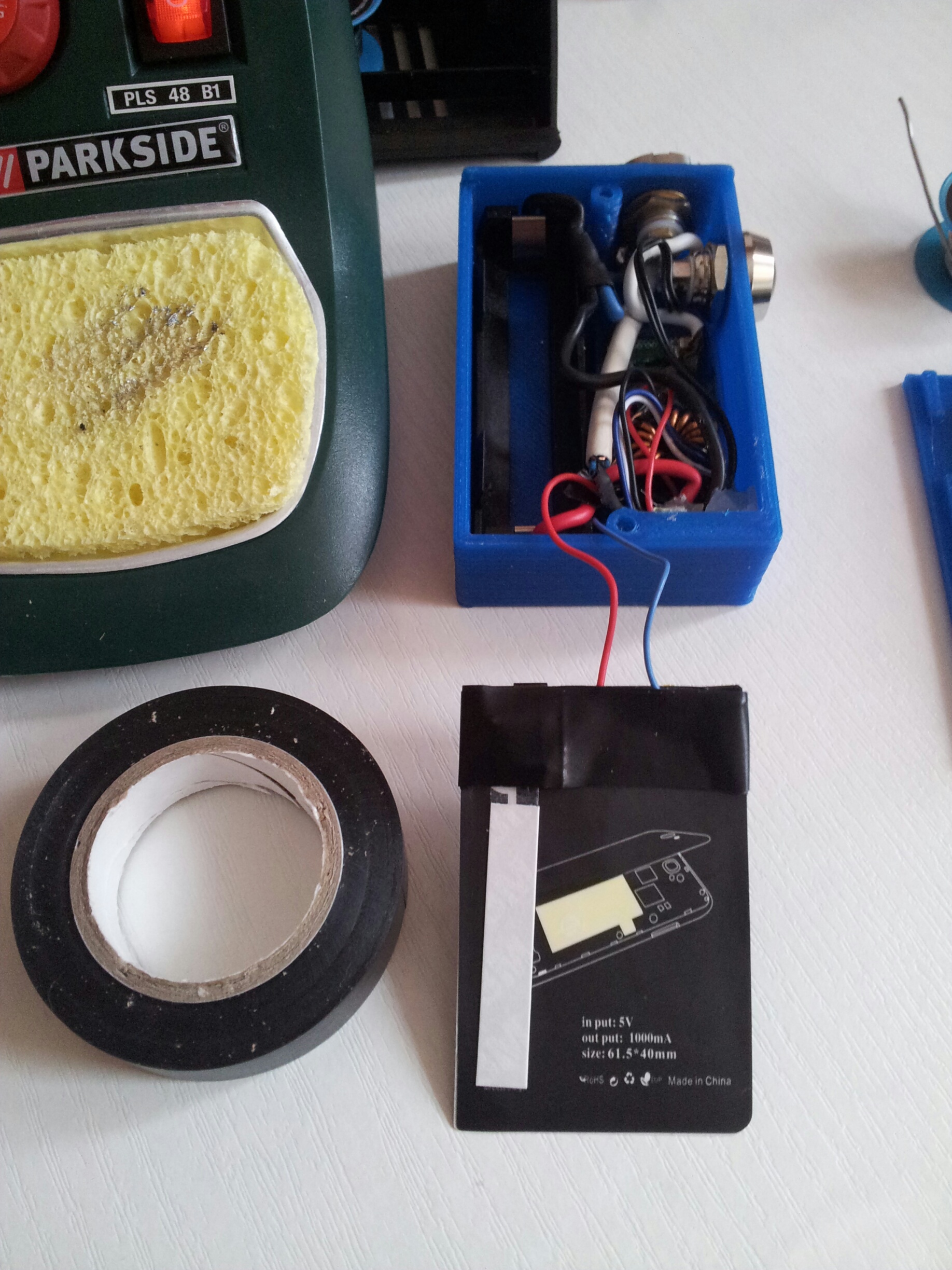 Zum Glück hatte ich auch gleich zwei Qi Sets gekauft,hatte also noch so ein Empfängerteil,also habe ich vom eingebauten die Kabel gelöst und diese an der neuen Empfangsplatine gelötet,den Plus Kontakt umgebogen und mit dem vorhandenen doppelseitigem Klebestreifen fixiert und beide Lötstellen mit Isoband provisorisch isoliert.