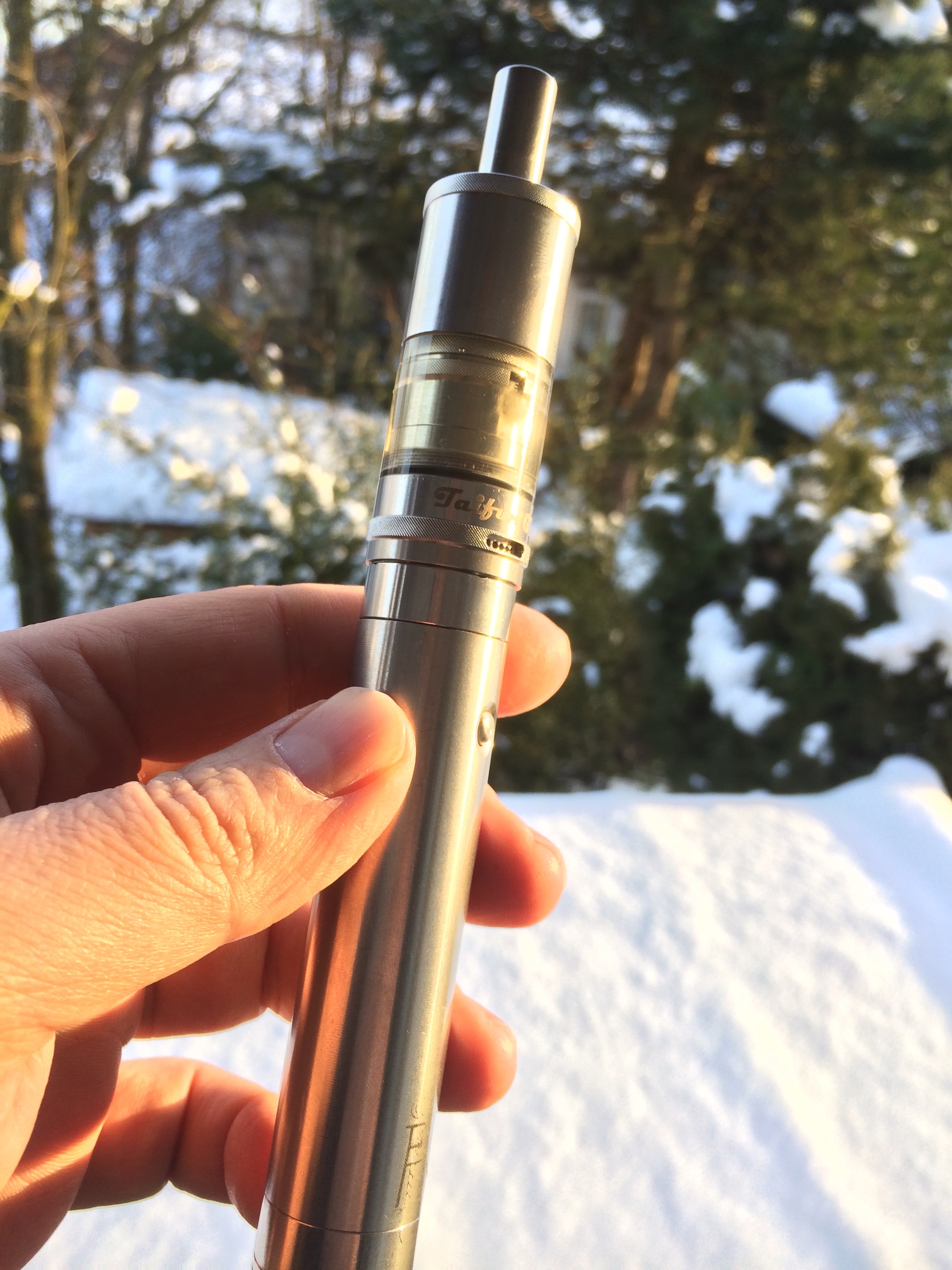 Tank und Topcap vom 1er, Base und Kammer vom 2er. Drip Tip ist eines vom Original Taifun von Smokerstore.