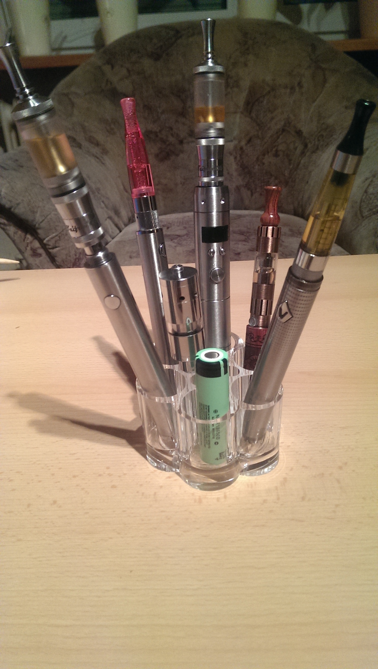 Da lasse ich mich doch nicht lumpen und stelle die gesammelten Suchtkolben unseres 2-Personen-Haushalts nach 4 Wochen Dampflehre in einem 3,99 € Ständer von Rossmann vor