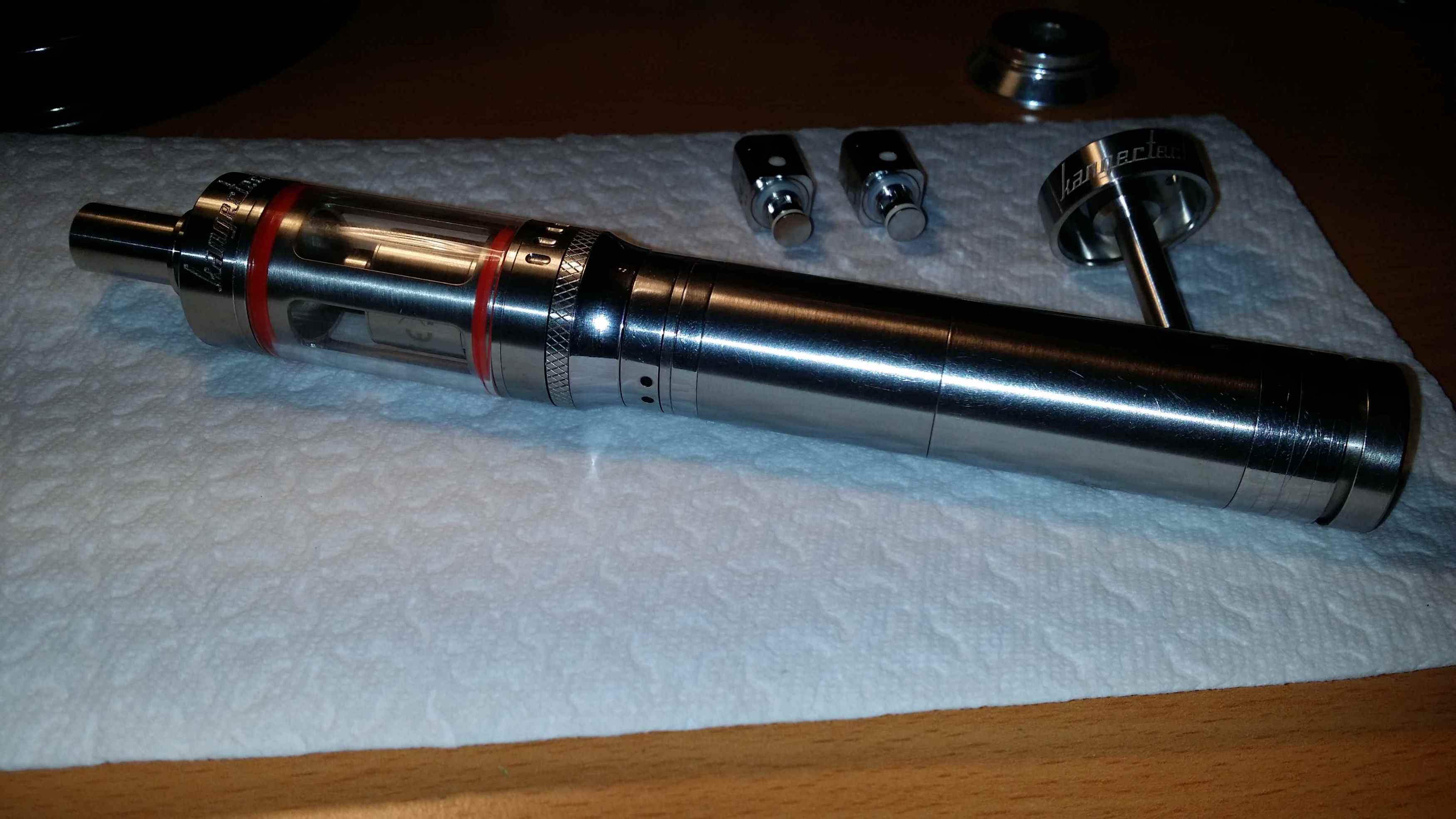 zum Detail..glastank 6ml fassungsvermögen,2 top-caps,cone für 22mm akkuträger,2 fertigwickelköpfe 1x1,2+1x0,5 ohm single-coil,einen selbswickel kopf fertig gewickelt mit dual-coil 0,43 ohm, mit verdampferkammer mit abschraubbaren Kamin.luftzugkontrolle die einrastet und gut dimensioniert ist,510er drip-tip mit 6,8mm Innendurchmesser und Kühlrippen,gefederten und vergoldeten Pluspol pin,2 fertige ersatzwicklungen,2 ersatz-kreutzschlitzschrauben,blauer Schraubendreher,japan wattepad.