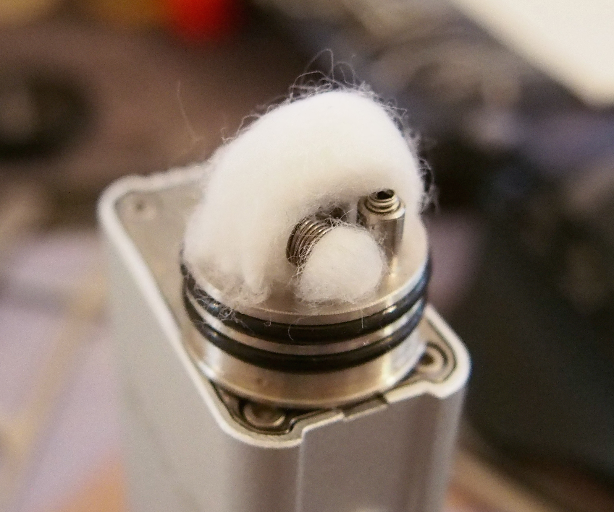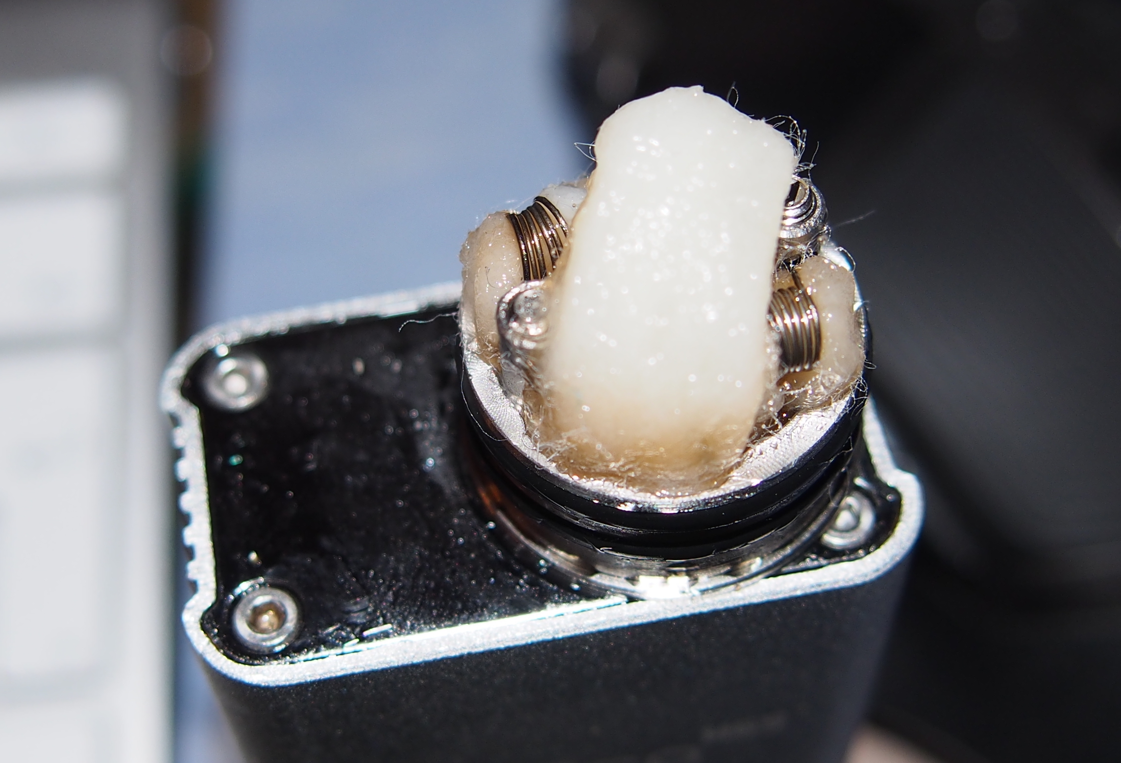 Bei der ersten Wicklung hab ich zu wenig Watte genommen und musste bei 0,6 Ohm mit 50 Watt alle 3-4 Züge Liquid nachfüllen.