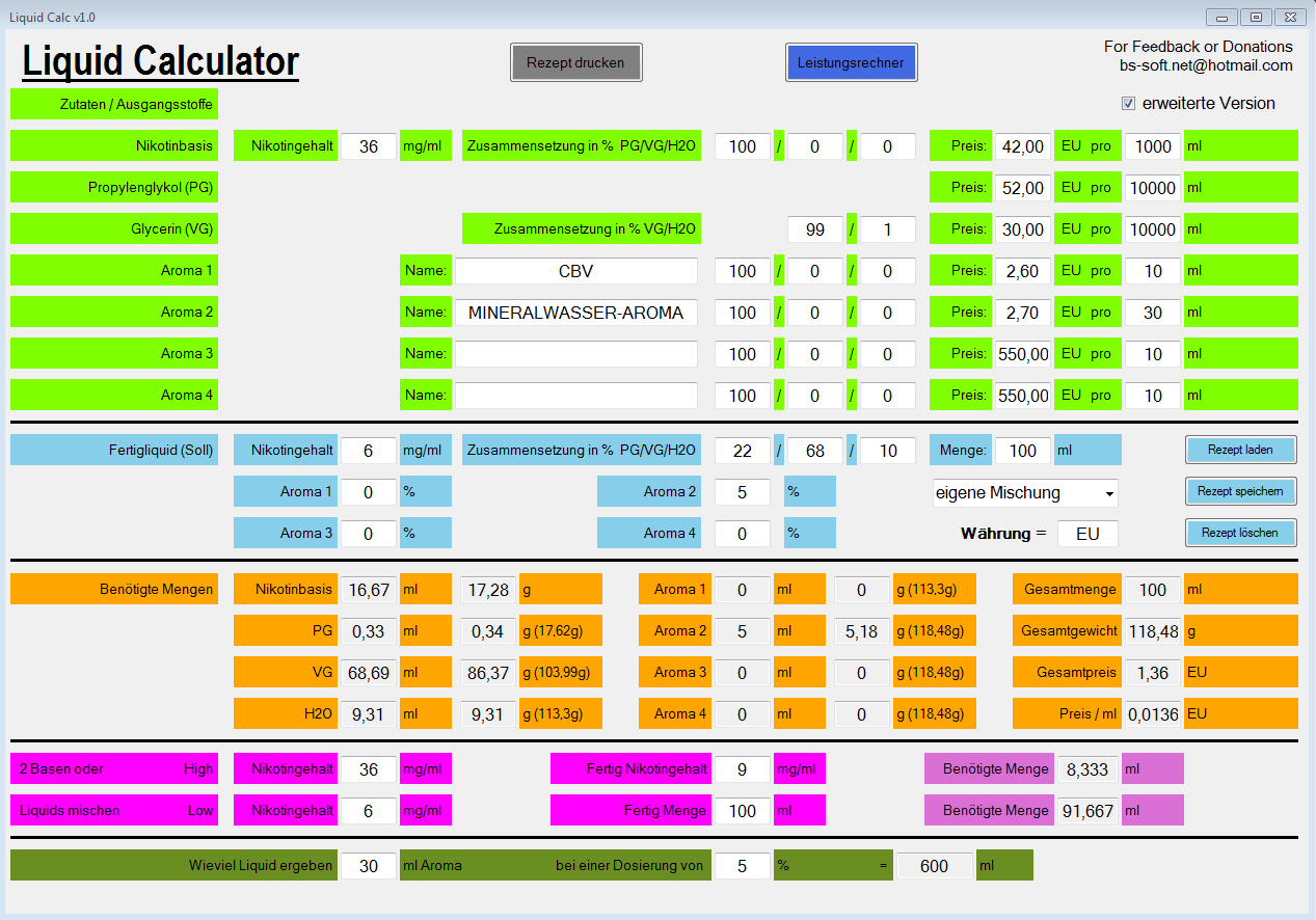 Da ich hobbymässig etwas mit VisualBasic programmiere habe ich mir damals selber einen einfachen Liquidrechner gebastelt und dachte mir jetzt ich schick Dir den mal zu. Sehr wahrscheinlich brauchst du den ja nicht, wäre aber cool wenn Du den mal anschauen könntest und ein Urteil abgeben könntest. Habe noch ein paar letzte Änderungen vorgenommen und hoffe dass alles passt. Wenn er denn für gut befunden wurde, kannst Du ihn auch gerne weitergeben. Ist Freeware, sozusagen ein Geschenk von mir an die Dampfergemeinde. Vor allem für all diejenigen die einen Offline-Rechner suchen bei dem man seine Rezepte auch abspeichern kann.
