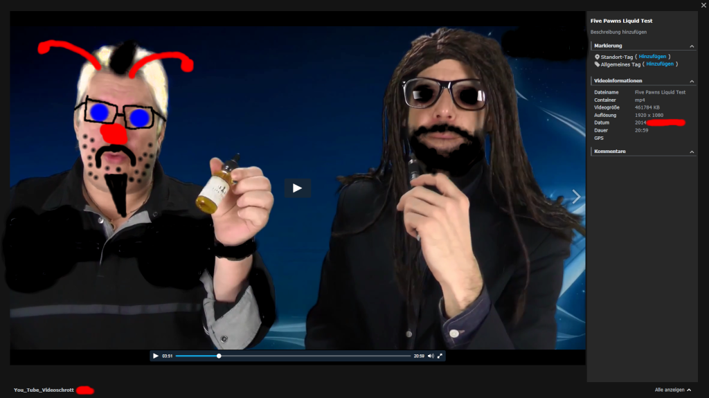 Das Video das ich suche beinhaltet einen Test der Five Pawns Liquids, mit einem Händler. Es geht ungefähr 20 Minuten, und ist auf dem Kanal des Original Uploaders gesperrt. Der Name des Youtubers beinhaltet Berlin und einen Vornamen mit K. Vielleicht hilft das Foto.