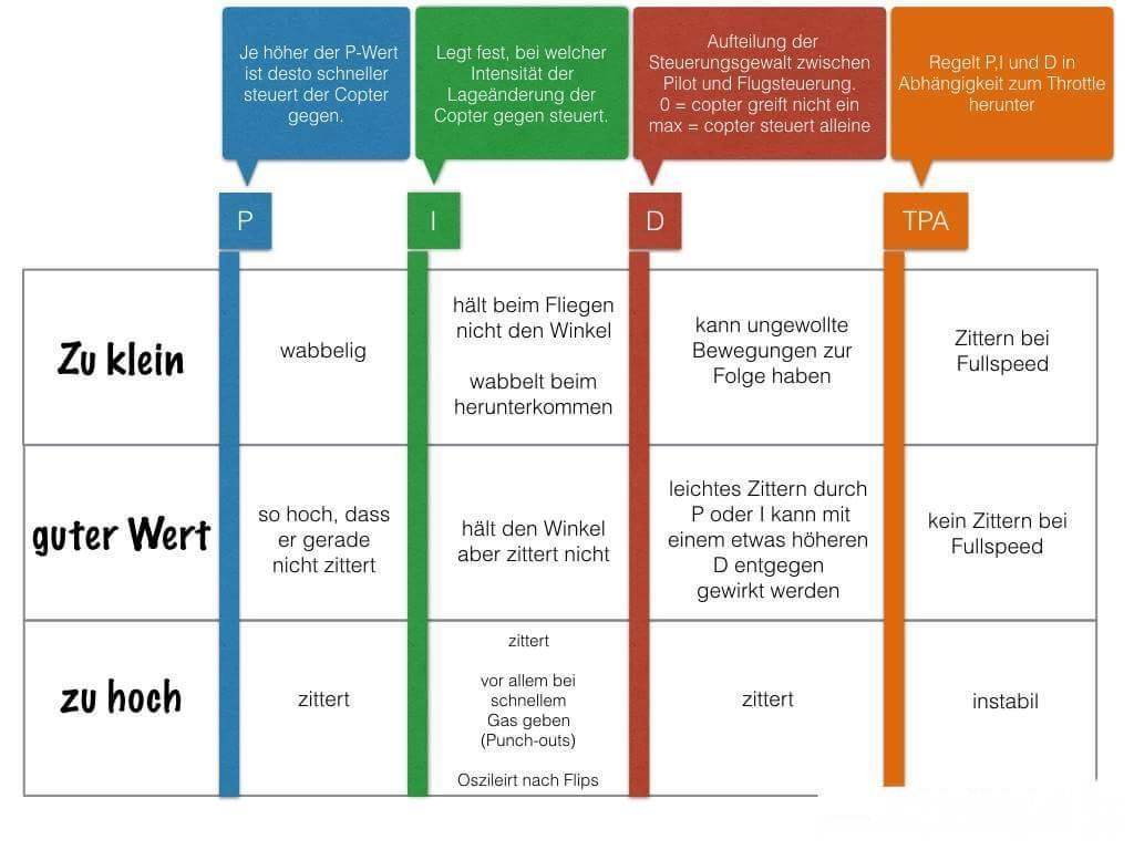 Also zum PID-Tuning schau mal unten das Bild. In Cleanflight unter PID-Tuning rechts "Roll&Pitch Rate" hochschrauben, damit Du moeglichst schnell rum kommst. Um ein Flip zu machen ist HOEHE Dein Freund. Gas geben; dann Gas drosseln; Flip durchfuehren und wieder Gas. Auto-Tune kann man zum PID-Tuning nutzen, aber bitte nur einmalig und nicht 2 mal hintereinander, denn er addiert sonst die Werte auf und die Kiste wird unkontrollierbar. Wenn man es wiederholen moechte, die alten Standard-Werte einspielen...gerse hat geschrieben:Vielen Dank für das gute Video zum Thema FPV.