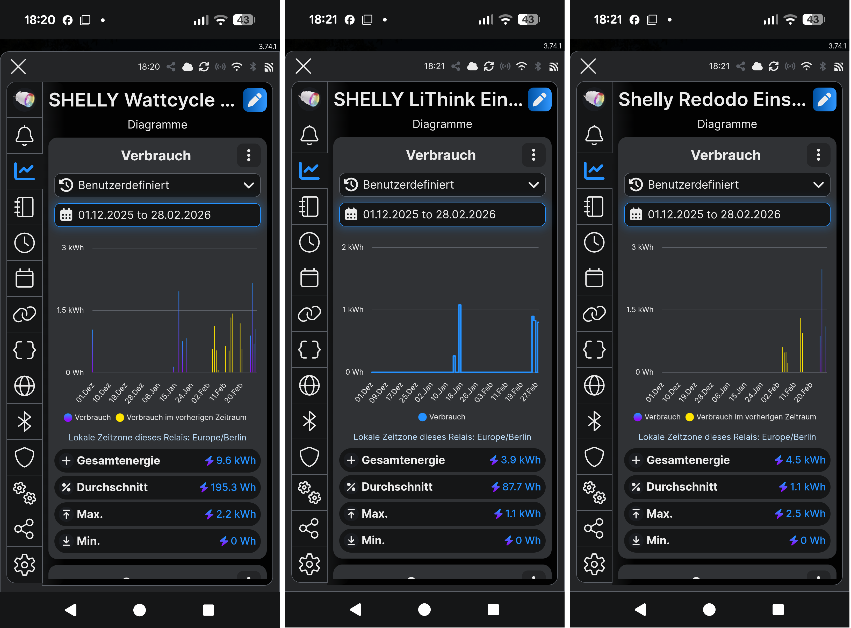 Hier die 3 Anlagen (Tuya Einspeise-Steckdosen) mit Summenangaben und Monatswerten im Monats-Detail (die Shellys haben zwar auch einige Kilowatt-Stunden erfasst, aber das verrechne ich dann rein mit in den Februar 2026):