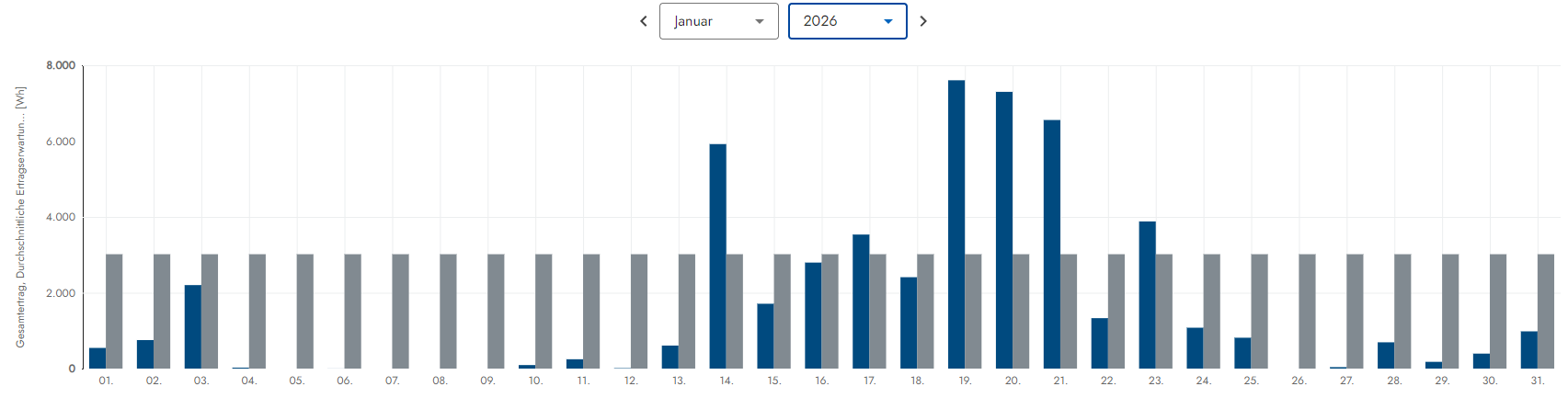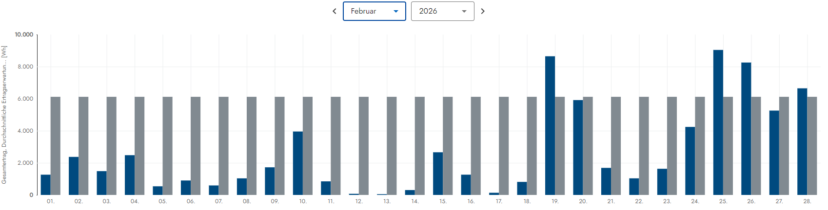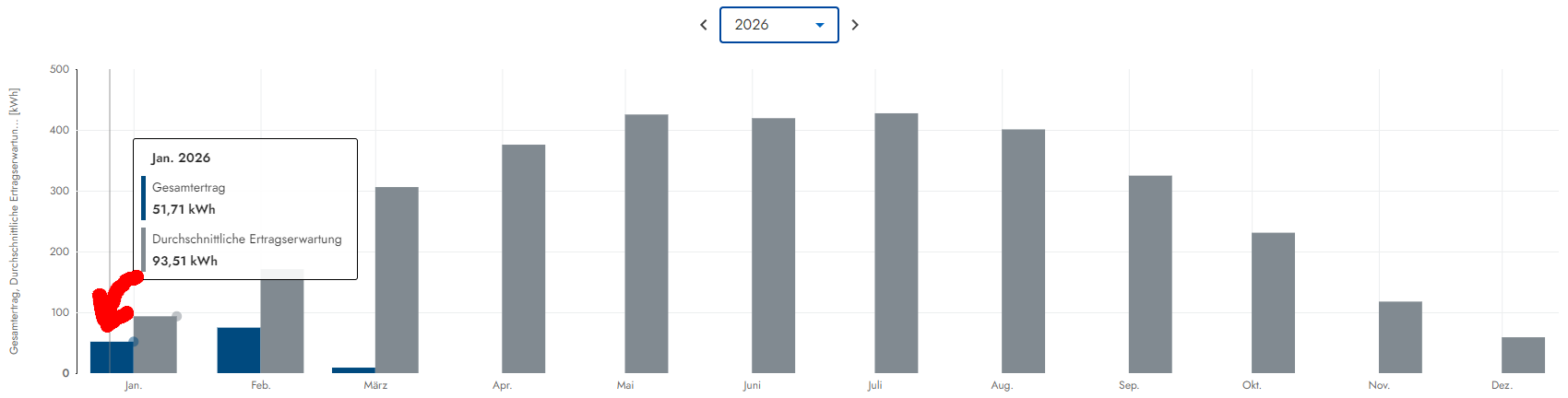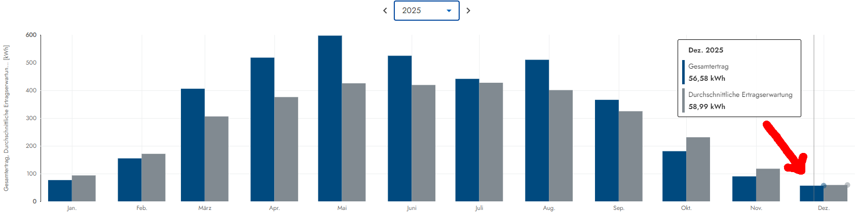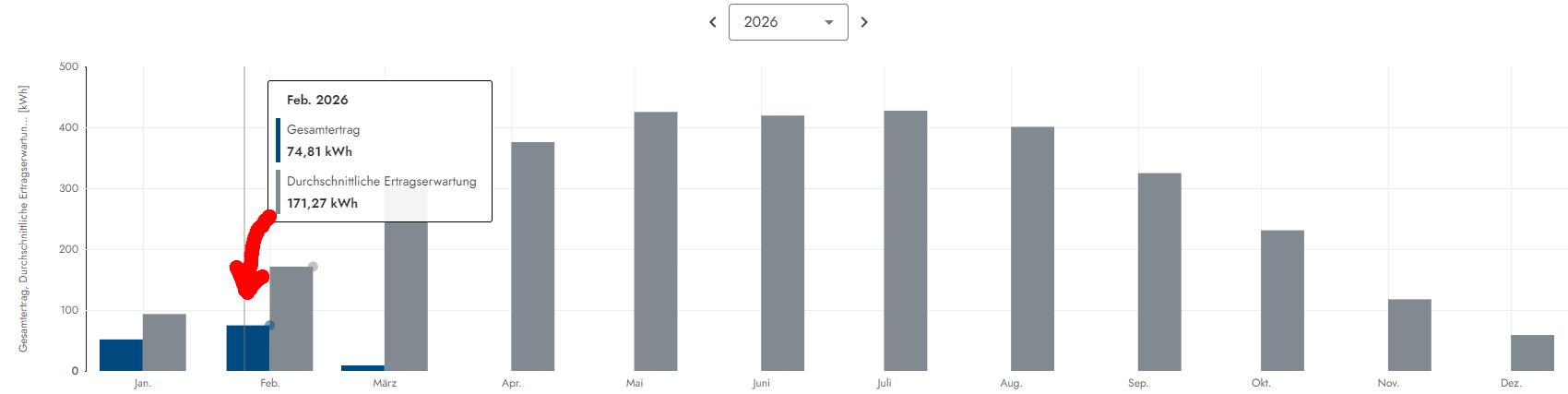 Hier die 4.2kwp Photovoltaik-Anlage auf dem Dach: Nun kommen wir aber wie jeden Monat zur kleinen 4,2kwp Dach PV Anlage und dem finalen Dezember; Januar & Februar-Ertrag. Die Ertragserwartung für den Dezember lag bei lächerlichen 58,99kwh und vom Dach kamen diesen Dezember immerhin noch 56,58kwh. Das entspricht für diesen Monat ein Minus von nur 4,1% gegenüber der Ertragserwartung. Die Ertragserwartung für den Januar lag bei lächerlichen 93,51kwh und vom Dach kamen diesen Januar nur 51,71kwh. Das entspricht für diesen Monat ein Minus von brutalen 44,7% gegenüber der Ertragserwartung. Die Ertragserwartung für den Februar 2026 lag bei 171,27kwh und vom Dach kamen diesen Februar nur 74,81kwh. Das entspricht für Februar ein Minus von nur vernichtenden 56,32% gegenüber der Ertragserwartung. Hier sieht man nun deutlich wie schlecht das Winter-Frost-Schnee Wetter wirklich war. Wo der Dezember noch ok war, sorgten die Erträge im Januar und Februar 2026 für neue Minus-Rekorde: