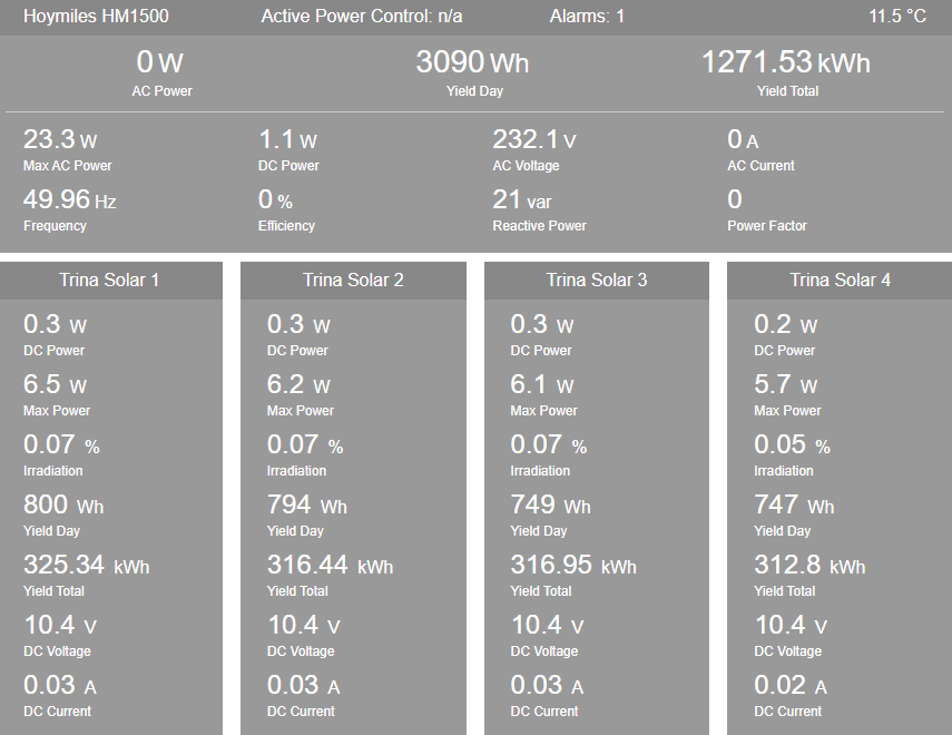 Balkon-Kraftwerk auf dem Carport: Die kleine Carport-Installation hat im Rahmen der Möglichkeiten versucht das Beste aus dem miesen November zu holen. Aber die Module bekommen kaum noch von der mittlerweile sehr tief stehenden Sonne Energie. Wenn dann 1-2 Stunden und die Verschattung gehend rasend schnell voran. Der alte HM800 der Carport-Anlage hat bis Anfang April 2025 ca. 642,67kwh (Mitte Mai 2024 installiert) vom Carportdach gefischt. Der "neue" HM1500 (Installation Mitte Mai 2025) hat in diesem November 1225,86kwh aufaddiert. Also in Summe hat das Carport somit schon 1868,53kwh geliefert. Somit ist es nicht mehr möglich alle 3 Einspeise-Systeme ausschliesslich mit dem Strom vom Carport zu laden da einfach nicht mehr genug Strom von den Modulen kommt. Seit Mai 2024 hat die Carport-Anlage nun nach nur 18 Monaten 542,25 Euro erwirtschaftet und nähert sich der vollen Armortisation. 2026 wird die komplette Installation im Geld sein! Ende November habe ich die Regenpause genutzt die verschlammten Drainage-Clips samt Modul-Ränder (die wurden schon Grün) zu reinigen. Abschliessend gab es dann auch noch ein Mob-Reinigung der vom Laub verklebten Modulflächen mit destilliertem Wasser (hat ca. 20 Minuten gedauert, da ich auf dem duennen Alu-Dach rumturnen musste). Sehen nun wieder Pickobello sauber aus, sodass die nächste Reinigung wohl erst im Sommer 2026 durchgeführt werden muss. Hier noch ein Screenshot des Hoymiles von der Carport-Anlage. Heute am 30 November schien sogar etwas die Sonne und der Ertrag ist erbärmlich. Wo sonst bis zu 11kwh produziert wurden, kommt Ende November und der Vetrschattung nur noch ein Bruchteil dessen von den Modulen:
