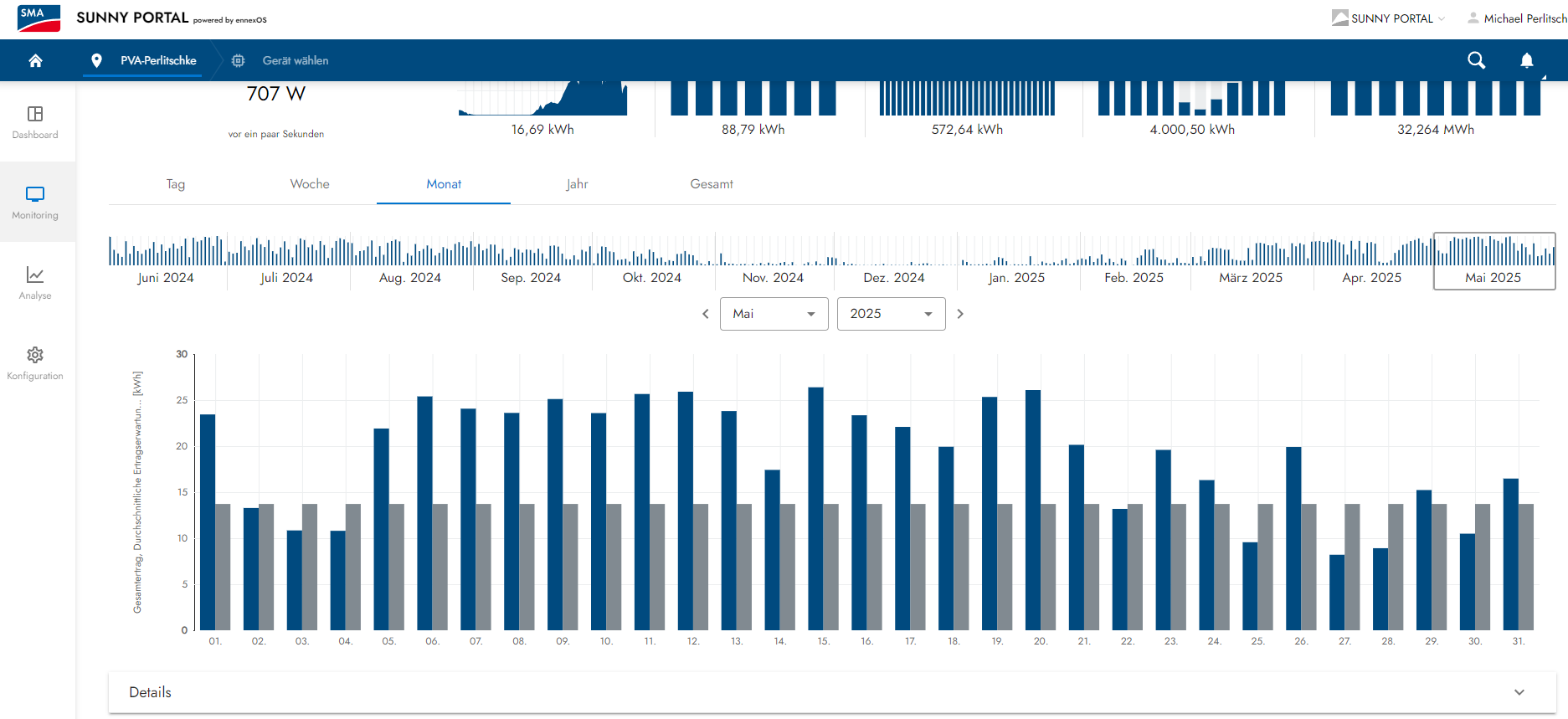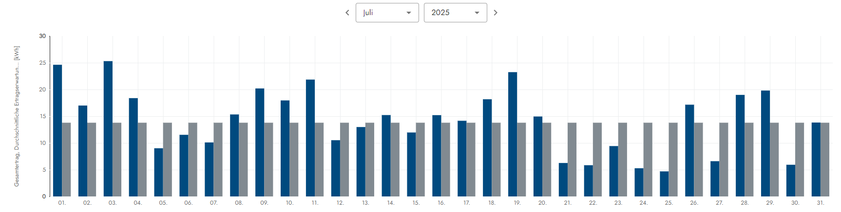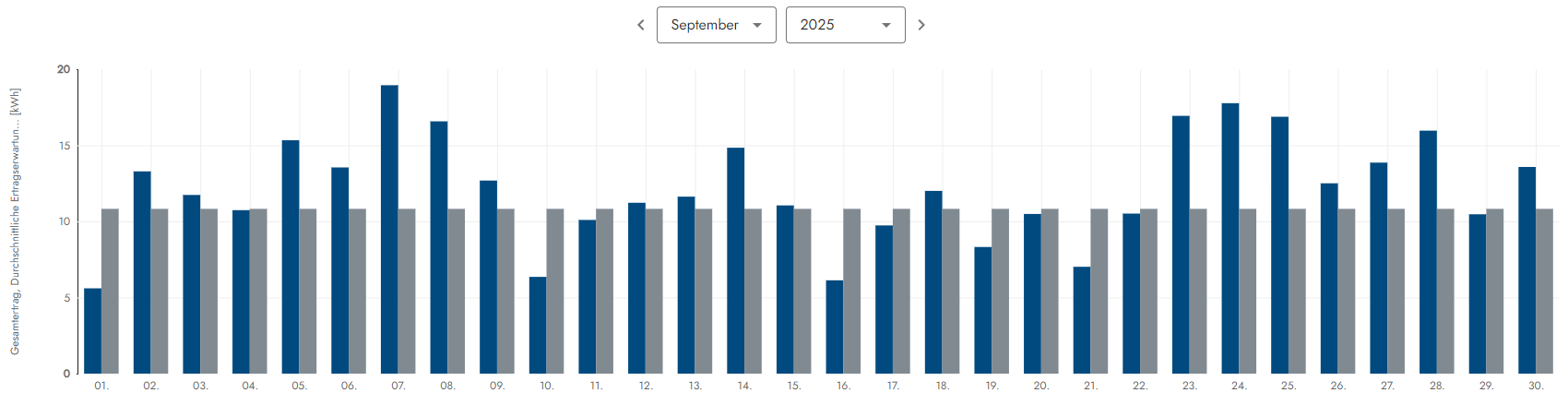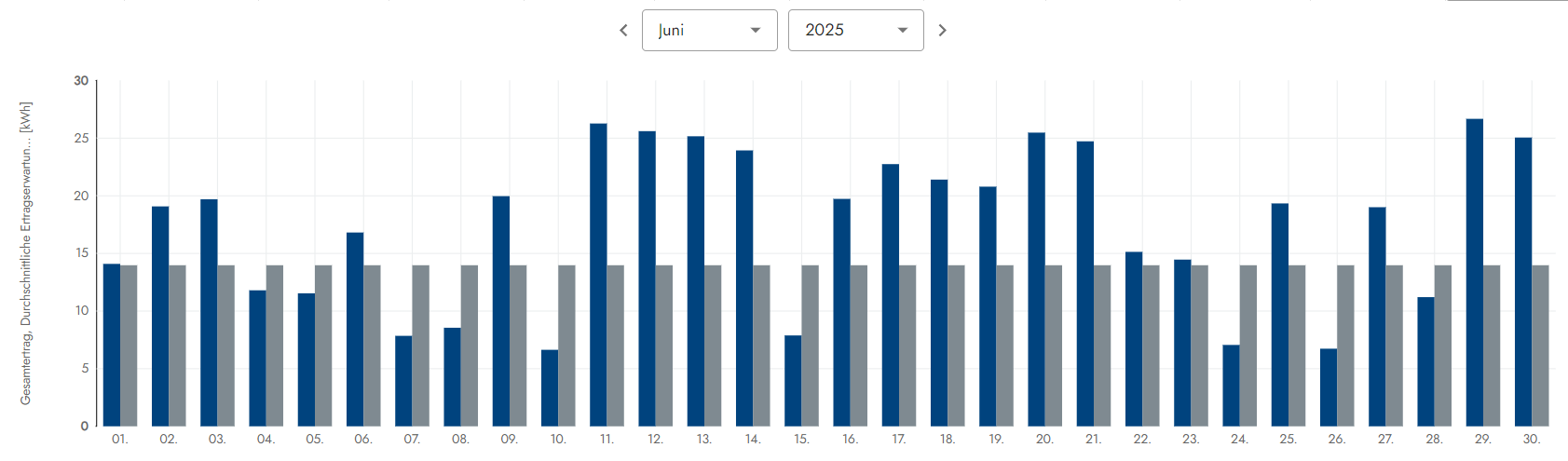 Wettersituation: Dieser viel zu trockene Mai war wirklich sehr schön, denn mit 20 Sonnentagen strahlte die zufrieden Sonne vom Himmel. Nur 9 Tage gab es einen Sonne-Wolkenmix resp. eine dünne Wolkendecke und 2 Tage hingen schwerere Wolververbände am Himnmelszelt. Alles in allem ein wirklich toller Mai, aber leider viel zu trocken da kaum Regen, denn die Natur braucht hin & wieder auch mal etwas Regen. Die Situation kann man sich wie folgt etwas genauer anschauen. Die grauen Balken sind die Ertragserwartung und die Blauen wieviel an Energie vom Himmel fiel: