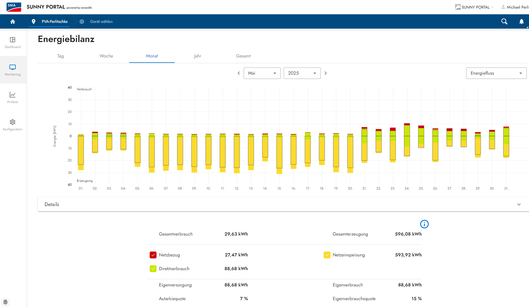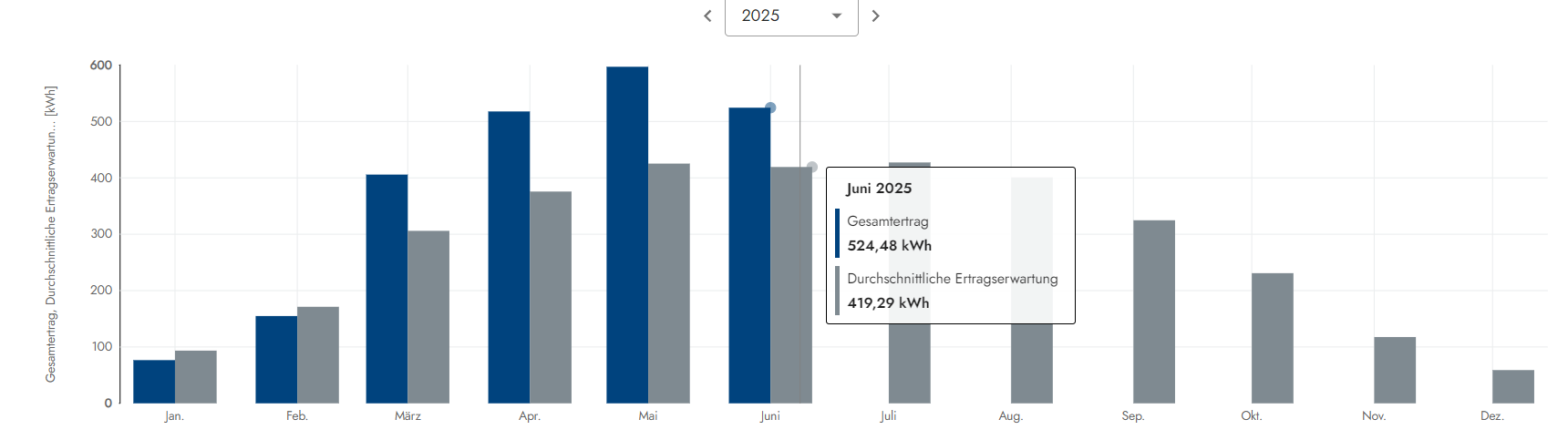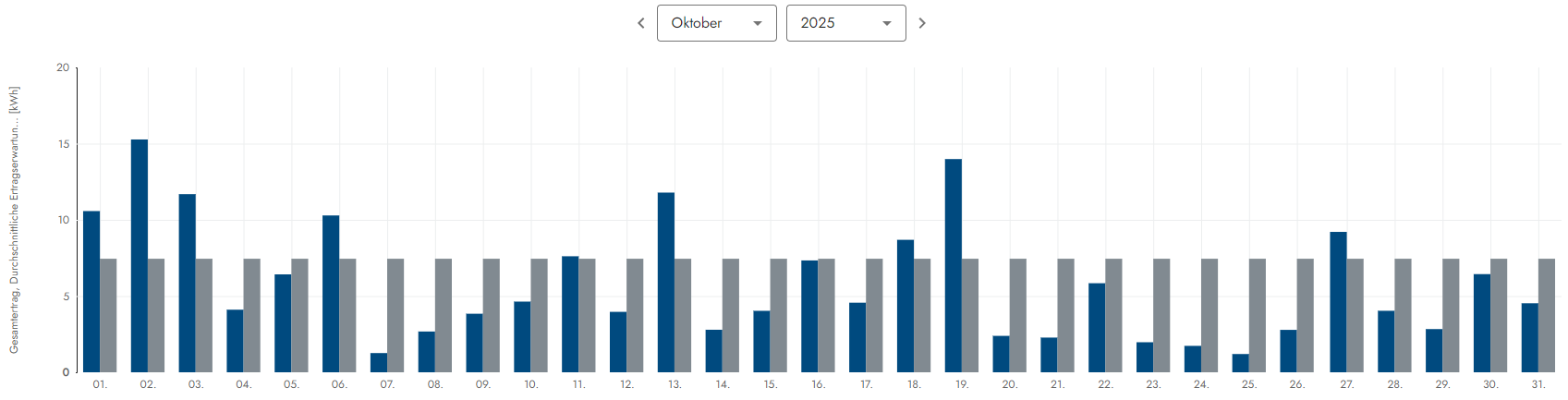 Wettersituation: Dieser viel zu trockene Mai war wirklich sehr schön, denn mit 20 Sonnentagen strahlte die zufrieden Sonne vom Himmel. Nur 9 Tage gab es einen Sonne-Wolkenmix resp. eine dünne Wolkendecke und 2 Tage hingen schwerere Wolververbände am Himnmelszelt. Alles in allem ein wirklich toller Mai, aber leider viel zu trocken da kaum Regen, denn die Natur braucht hin & wieder auch mal etwas Regen. Die Situation kann man sich wie folgt etwas genauer anschauen. Die grauen Balken sind die Ertragserwartung und die Blauen wieviel an Energie vom Himmel fiel: