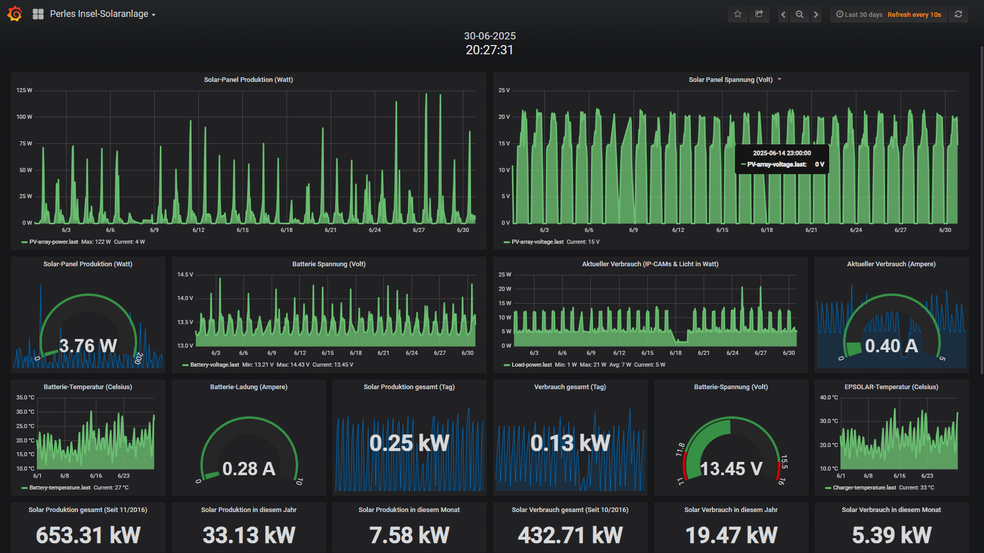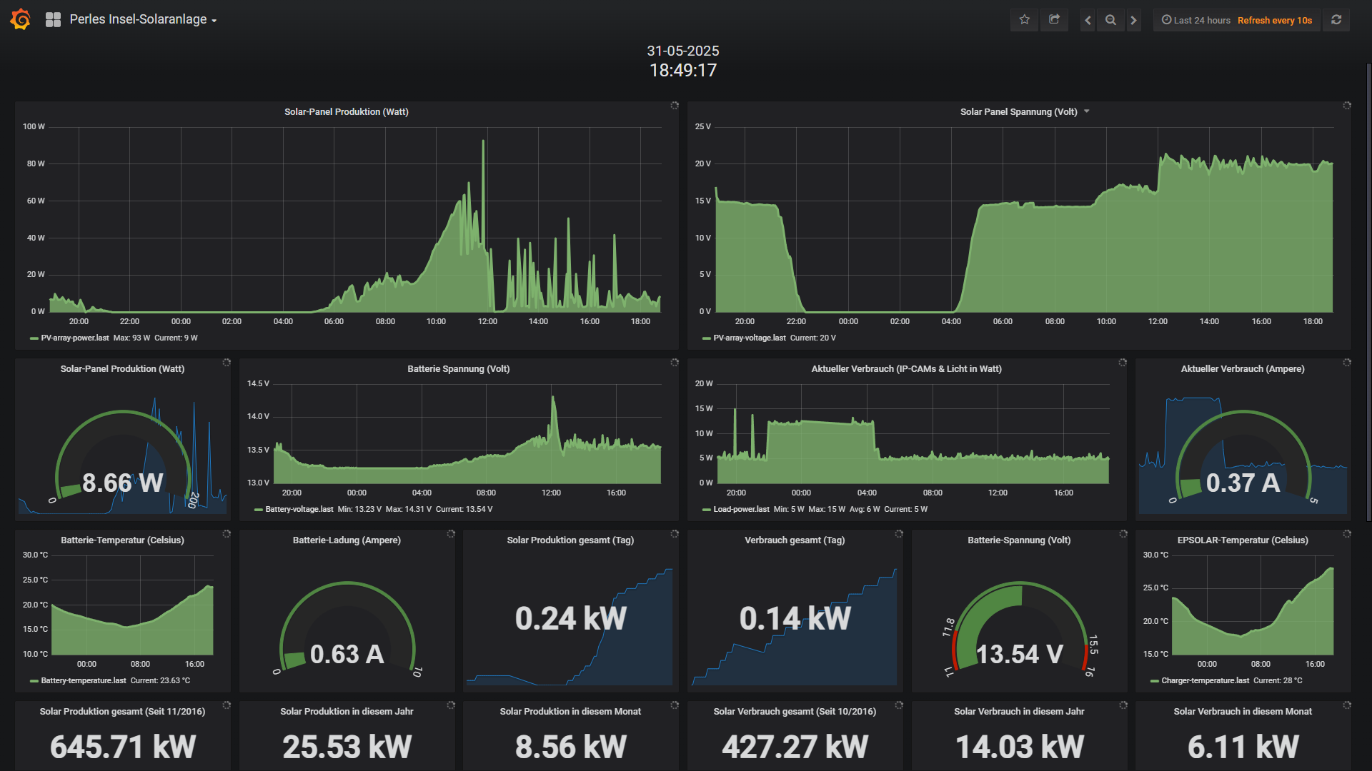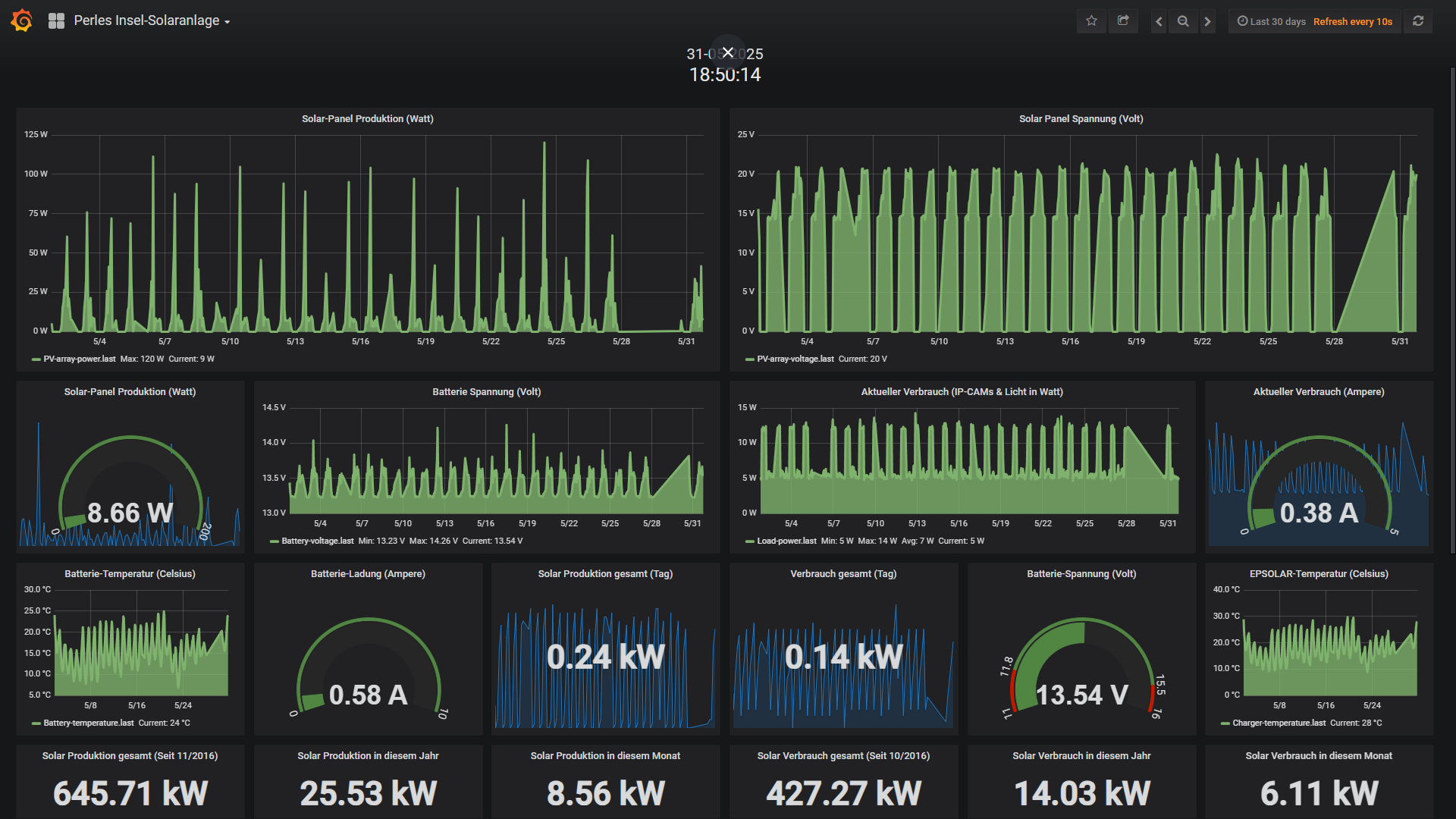 Ende Mai habe ich dann etwas experimentiert und herausgefunden das mein FritzRepeater 600Mbit scheinbar nach vielen Monaten etwas Murks baut und der Raspberry keine stabile Verbindung mehr aufbauen und halten kann. Das ist mit einem Neustart aber zu beheben und scheint ein Firmware-Bug zu sein, denn ich mittlerweile auch gemeldet habe. Davon ab, legt der neue Akku ein brutal stabiles Lastverhalten an den Tag und sah dann in der Insel-Anlage für den Mai so aus: