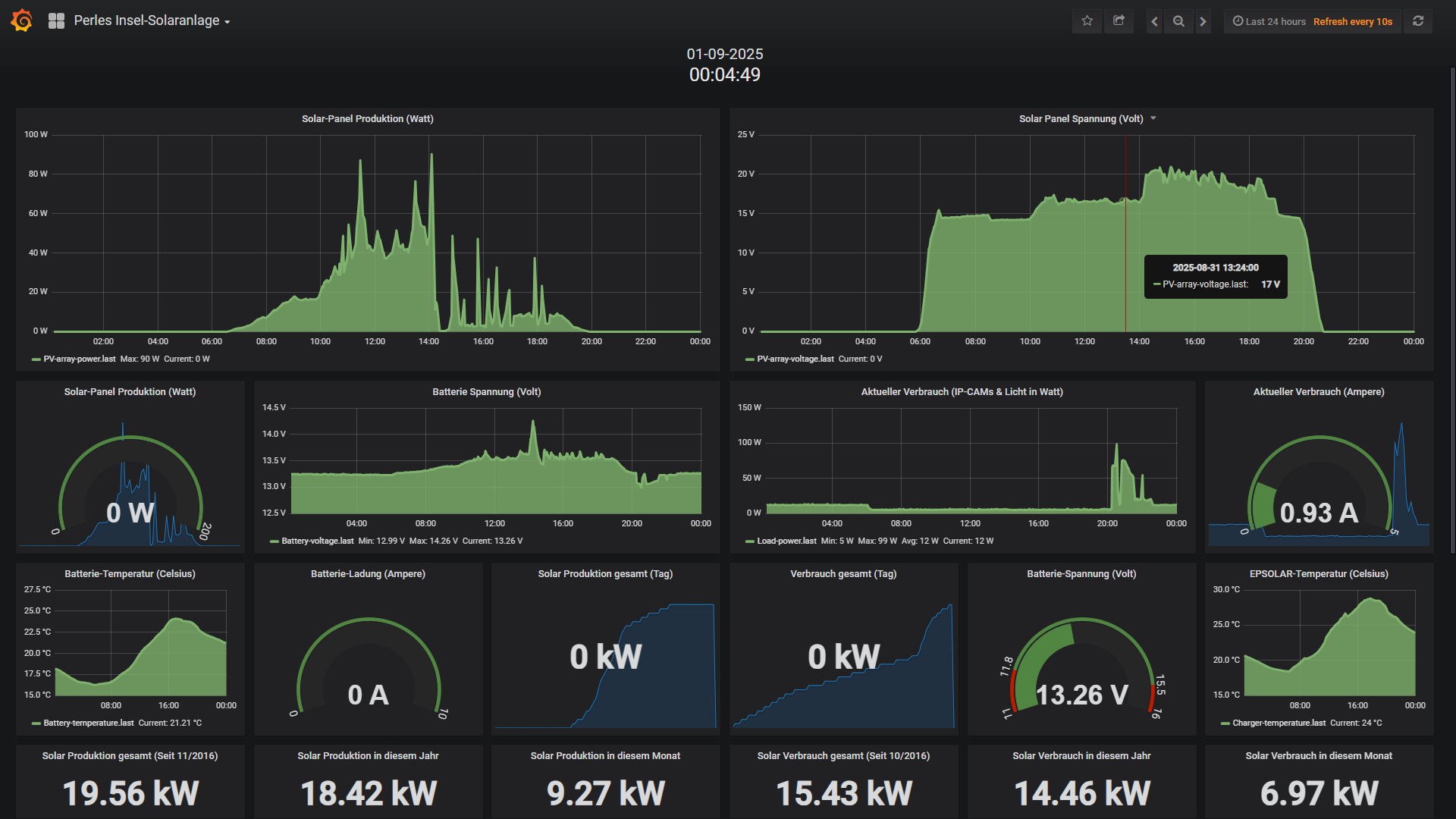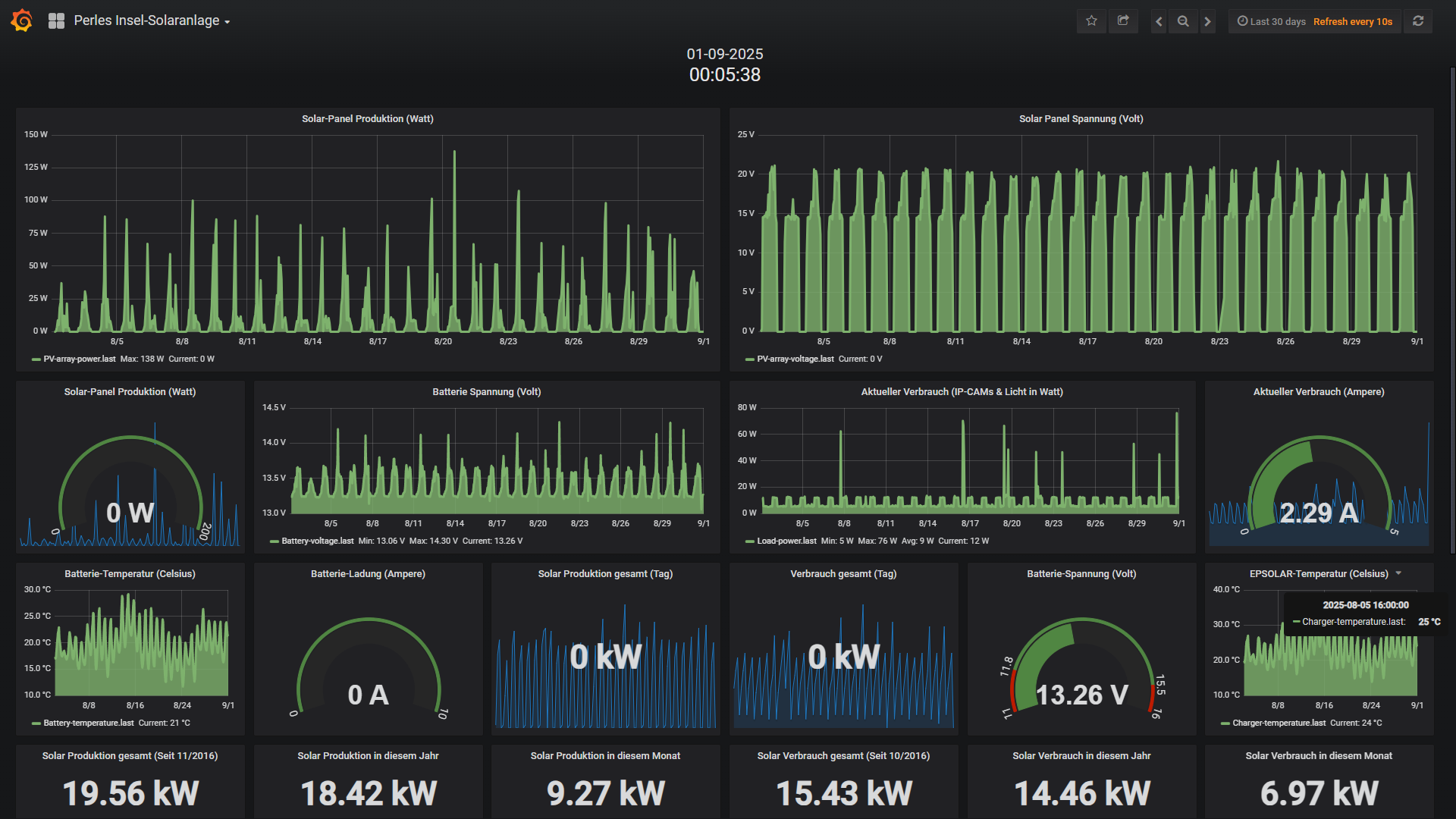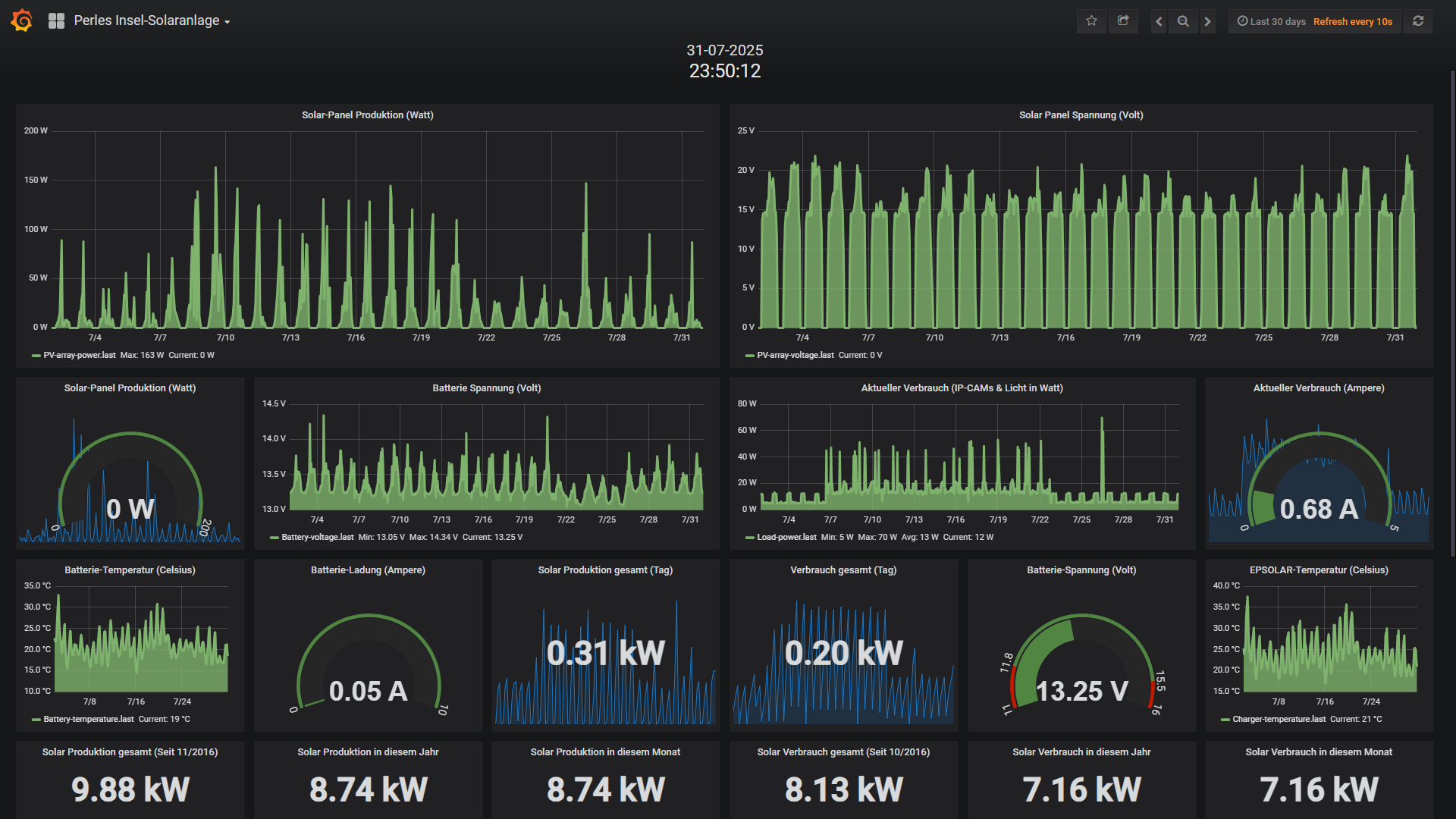 Ende Mai habe ich dann etwas experimentiert und herausgefunden das mein FritzRepeater 600Mbit scheinbar nach vielen Monaten etwas Murks baut und der Raspberry keine stabile Verbindung mehr aufbauen und halten kann. Das ist mit einem Neustart aber zu beheben und scheint ein Firmware-Bug zu sein, denn ich mittlerweile auch gemeldet habe. Davon ab, legt der neue Akku ein brutal stabiles Lastverhalten an den Tag und sah dann in der Insel-Anlage für den Mai so aus: