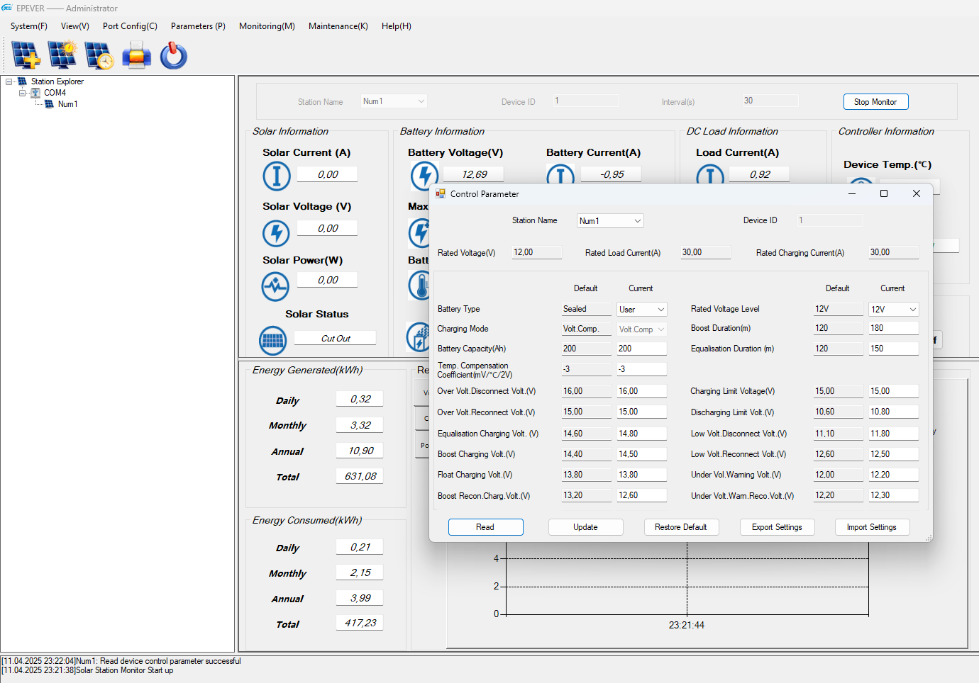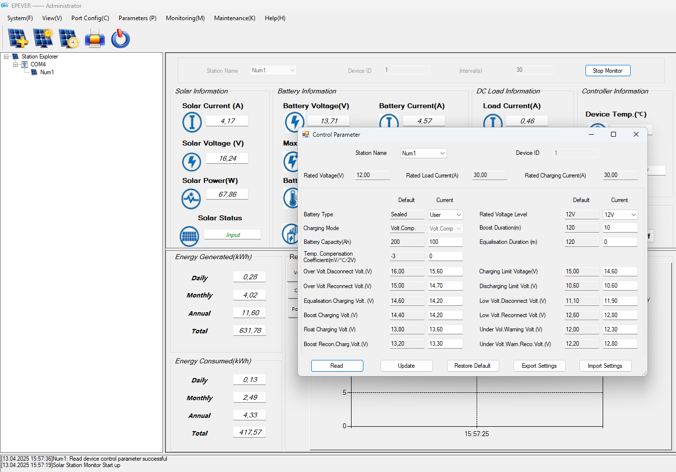 Die kleine 200 Watt Insel-Solaranlage: Der "neu eingebaute" 100Ah LiFePo4 Akku macht einen erstklassigen Job. Er ist wie nicht viel anders für einen Mai zu erwarten immer Ruckzuck wieder zu 100% mit Energie gefüllt und Nachts verliert dieser LiFePo4 Typisch fast keine Spannung und liefert solide die geforderte Energie für alle Verbraucher. Nun werden hier einige sicherlich fragen: "Perle wie hast Du Dein EPEVER Solar-Regler der bisher die Blei-Saeure Batterien geladen hat für den Einsatz an einem LiFePo4 Akku konfiguriert". Diese Frage möchte ich hier auch beantworten und Euch meine Einstellungen zeigen. Das erste Bild zeigt die Konfig. mit der ich die letzten 7-8 Jahre die Blei-Säure Batterien geladen habe: