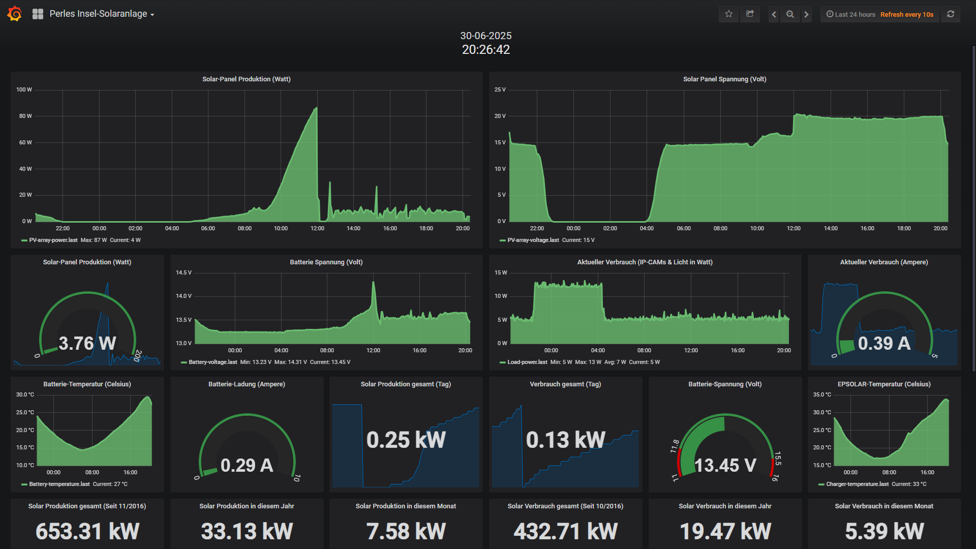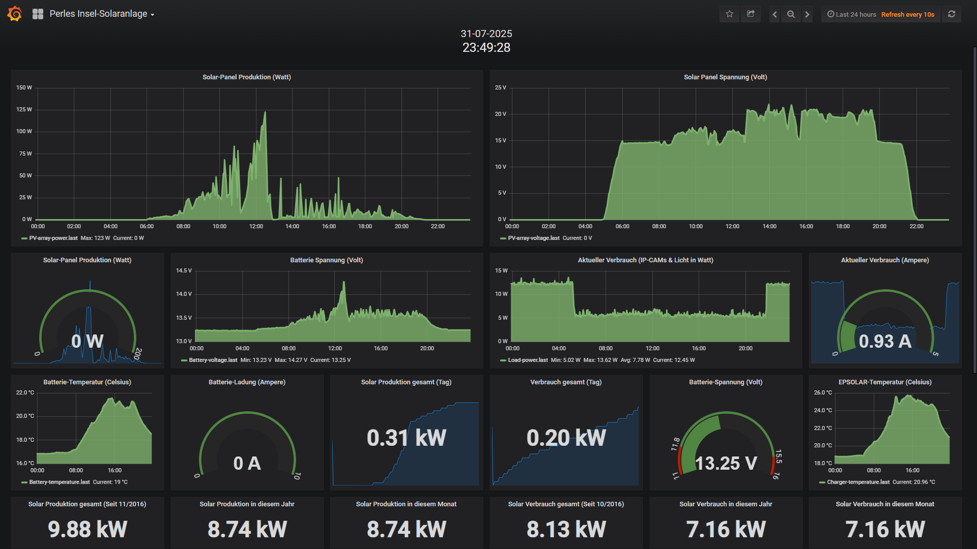 Die kleine 200 Watt Insel-Solaranlage: Eigentlich gibt es hier nicht viel zu berichten. Der LiFePo4 100Ah Akku macht einfach nur Spass und er vorsorgt zuverlässig alle Verbraucher und wird genauso zuverlässig von den beiden mittlerweile fast 10 Jahre 100 Watt Modulen versorgt. Auch der Ladungsstop funktioniert perfekt um im Tages-Chart sieht man genau wann der Akku vollgeladen ist da die Ladespannung mit einem Schlag absackt. Natürlich war auch der Stromhunrige Anthbot Rasenmäher-Roboter regelmässig unterwegs (sogar in der Dämmerung, da dieser ein Scheinwerfer für den Nachtbetrieb verbaut hat); wurde wieder auf 100% aufgeladen und dann die Stromzuvor mit meinem letzten Monat installierten 4 Channel Relais-Board ferngesteuert gekappt. Also alles bestens mit der Insel-Anlage die nun seit 10 Jahren wie ein gut geöltes Uhrwerk läuft. Und der Wechsel von Blei/Säure zum LiFePo4 war eine extrem gute Entscheidung.