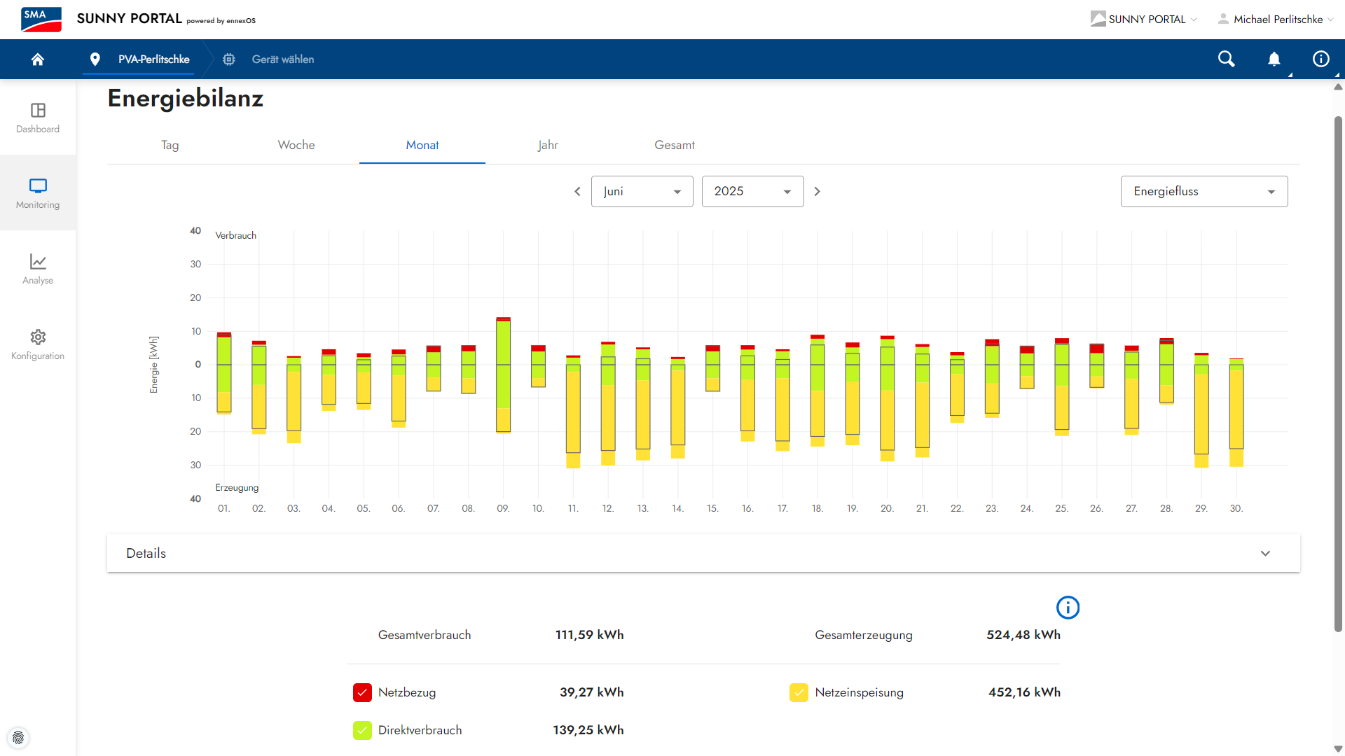 Hier die 4.2kwp Photovoltaik-Anlage auf dem Dach: Nun kommen wir zur kleinen 4,2kwp Dach PV Anlage und dem Juni-Ertrag. Die Ertragserwartung für den Juni lag bei 419,29kwh und vom Dach kamen satte 524,48kwh. Das entspricht für diesen Monat ein Plus von 25,09% gegenüber der Ertragserwartung. Da es diesen Monat an 12 Tagen nicht optimal mit dem Wetter lief dennoch ein sehr gutes und absolut solides Monats-Ergebnis!