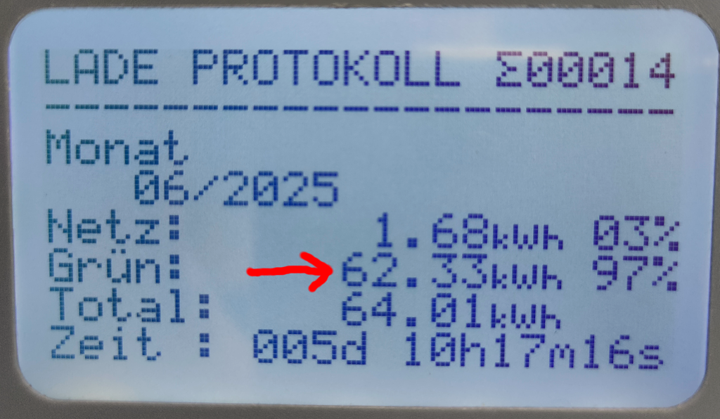 Balkon-Kraftwerk auf dem Carport: Die kleine Carport-Installation war auch diesen Juni sehr fleissig und fische erneut mächtig Strom vom Carport-Dach. Der alte HM800 der Carport-Anlage hat bis Anfang April 2025 ca. 642,67kwh (Mitte Mai 2024) vom Carportdach gefischt. Der neue HM1500 (Installation Mitte Mai 2025) hat in diesem Juni 620kwh produziert. Also in Summe hat das Carport somit 1262.67kwh geliefert. Somit ist es nun möglich alle 3 Einspeise-Systeme ausschliesslich mit dem Strom vom Carport zu laden wobei diese Ladung besonders schnell erledigt ist. Dann geht pro Akku und Nacht 15-20% der Kapazität ins Haus. Und das bisschen an Energie muss dann nur noch am Folgetag wieder aufgefüllt werden. In der Übergangszeit (Wärmepumpe im Heizbetrieb) mit längen Nächten haben die 3 Systeme aber einiges zu leisten und sind dann alle 3 morgens fast leer. Seit Mai 2024 hat die Carport-Anlage nun schon nach nur 13 Monaten 392,69 Euro erwirtschaftet. Genial!