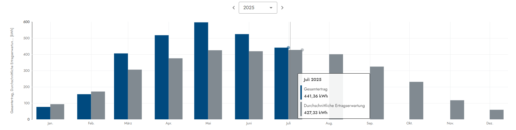 Hier die 4.2kwp Photovoltaik-Anlage auf dem Dach: Nun kommen wir zur kleinen 4,2kwp Dach PV Anlage und dem Juli-Ertrag. Die Ertragserwartung für den Juni lag bei 427,33kwh und vom Dach kamen wegen des gruseligen Wetters gerade mal 441,36kwh. Das entspricht für diesen Monat nur ein mageres Plus von 3% gegenüber der Ertragserwartung. Das ist mit weitem Abstand der schlechteste Juli-Wert seit Inbetriebnahme im Jahr 2017. Dennoch hat es die Anlage wenn auch nur glücklich geschafft knapp über die Ertragserwartung zu klettern. Das ist sehr schade, da der Juli auch Betriebswirtschaftlich immer einer der ganz starken Monate ist.
