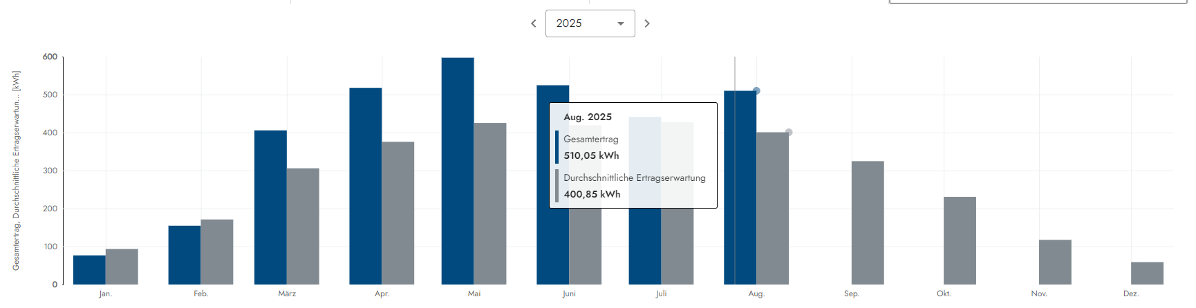 Der fünfte Monat im 9ten Produktionsjahr legt wie auch schon die drei Vormonate (April; Mai; Juni / Juli) erneut gut vor. Von den Investitionskosten in Höhe von 6600 Euro resp. 7854 inkl. MwSt. für die Dach PV sind wir nicht mehr sonderlich weit entfernt. Im ersten Halbjahr 2026 wird die 6600 Euro Marke definitiv fallen und das Jahr drauf also irgendwann im 10/11 Produktionsjahr auch die 7854 Euro Invest-Grenze. Somit hat sich die Investition der PV-Anlage zu 100% armortisiert. Die Carportanlage welche ja jetzt dabei hilft die grosse PV-Anlage zu stützen kommt dann danach (schaetze mal, das wird ein paar Monate dauern) und danach dann die 3 Speicher (8,1kwh Kapazität) Systeme was ca. weitere 2 Jahre dauern wird. Alles läuft somit fast schon besser als geplant und das trotz um 23% gesunkender Strom-Bezugskosten durch den Wechsel von den Stadtwerken Kiel zu Octopus im Sep. 2024. Aber diese spielen durch die Speicher keine wirklich entscheidende Rolle, da sich immer mehr alles in Richtung Eigenverbrauch bewegt, was ja auch der Sinn einer PV-Anlage ist und die Wirtschaftlichkeit wie gut zu erkennen ist segnifikant pusht!