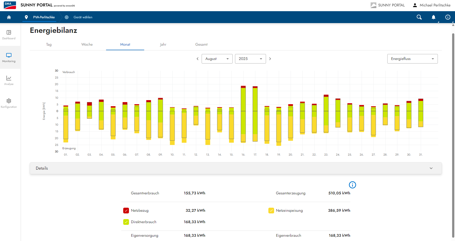 Hier die 4.2kwp Photovoltaik-Anlage auf dem Dach: Nun kommen wir aber wie jeden Monat zur kleinen 4,2kwp Dach PV Anlage und dem finalen August-Ertrag. Die Ertragserwartung für den August lag bei 400,85kwh und vom Dach kamen wegen des tollen August Wetters satte 510,05kwh. Das entspricht für diesen Monat nur ein grosses Plus von 27,24% gegenüber der Ertragserwartung. Das ist ein erstklassiger August-Ertrag und im oberen Bereich seit der Inbetriebname im Jahr 2017. Betriebswirtschaftlich läßt dieses Ergebnis das Herz eines jeden PV-Nutzers schneller und höher schlagen, denn dieser Monat war "stark":