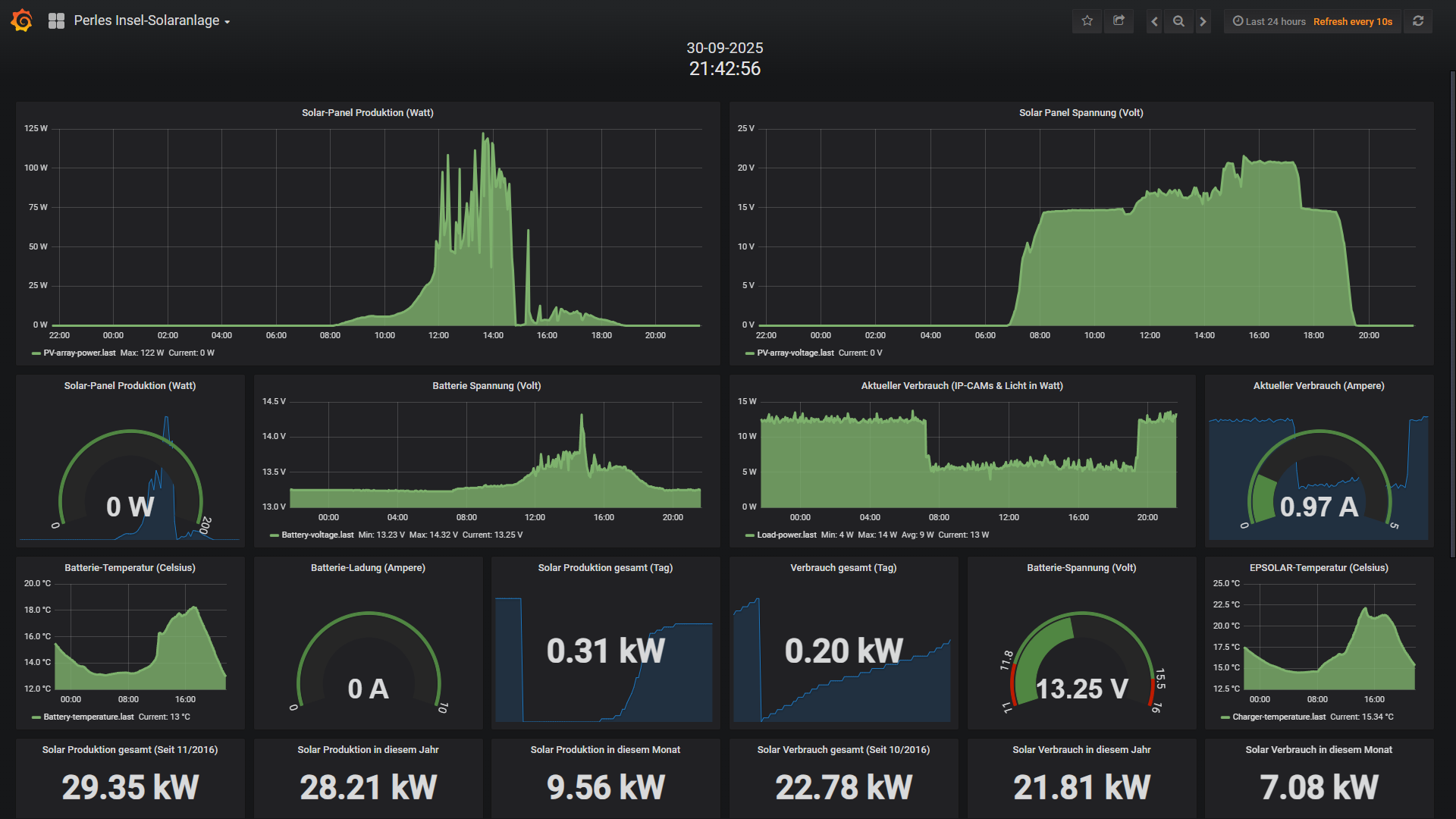 Die kleine 200 Watt Insel-Solaranlage: Der LiFePo4 100Ah Akku hatte im September keine Probleme, aber man merkt schon deutlich das die Tage immer schneller kürzer werden. Imn diesem September gab es bezüglich des Daten-Loggers oder des Com-Ports des EPEVERS Solarreglers aber zwei Aussetzer welche ich nach 1-2 Tagen bemerkt habe. Mit einem Reset des PI war die Sache aber flott erledigt. Diesen Komplett-Reset konnte ich bequem mit meinem Smartphone und BT aus meinem Heimkinozimmer vornehmen. Hierzu einfach die LAST des Akkus im BMS Nachts ausschalten (alle Verbraucher samt Laderegler sind dann tot) und 20 Sekunden später wieder im BMS einschalten. Seit dem 21 September läuft Logging-Seitig wieder alles rund. Auch die automatischen Voll-Backups der 32GB SD Karte auf meine Synology liefen wie geschnitten Brot. Seit Jahren kommt es hin und wieder immer mal vor das sich der COM Port im EPEVER aufhängt. Zum Glück aber sehr selten. Damals wo noch die BleiSäure Akkus im Einsatz waren musste ich Nachts immer in den Schuppen und den Akku manuell kurz vom System nehmen. Mit dem LiFePo4 und dessen BT ist das nun in Sekunden aus dem Zimmer zu erledigen. Echt praktisch!