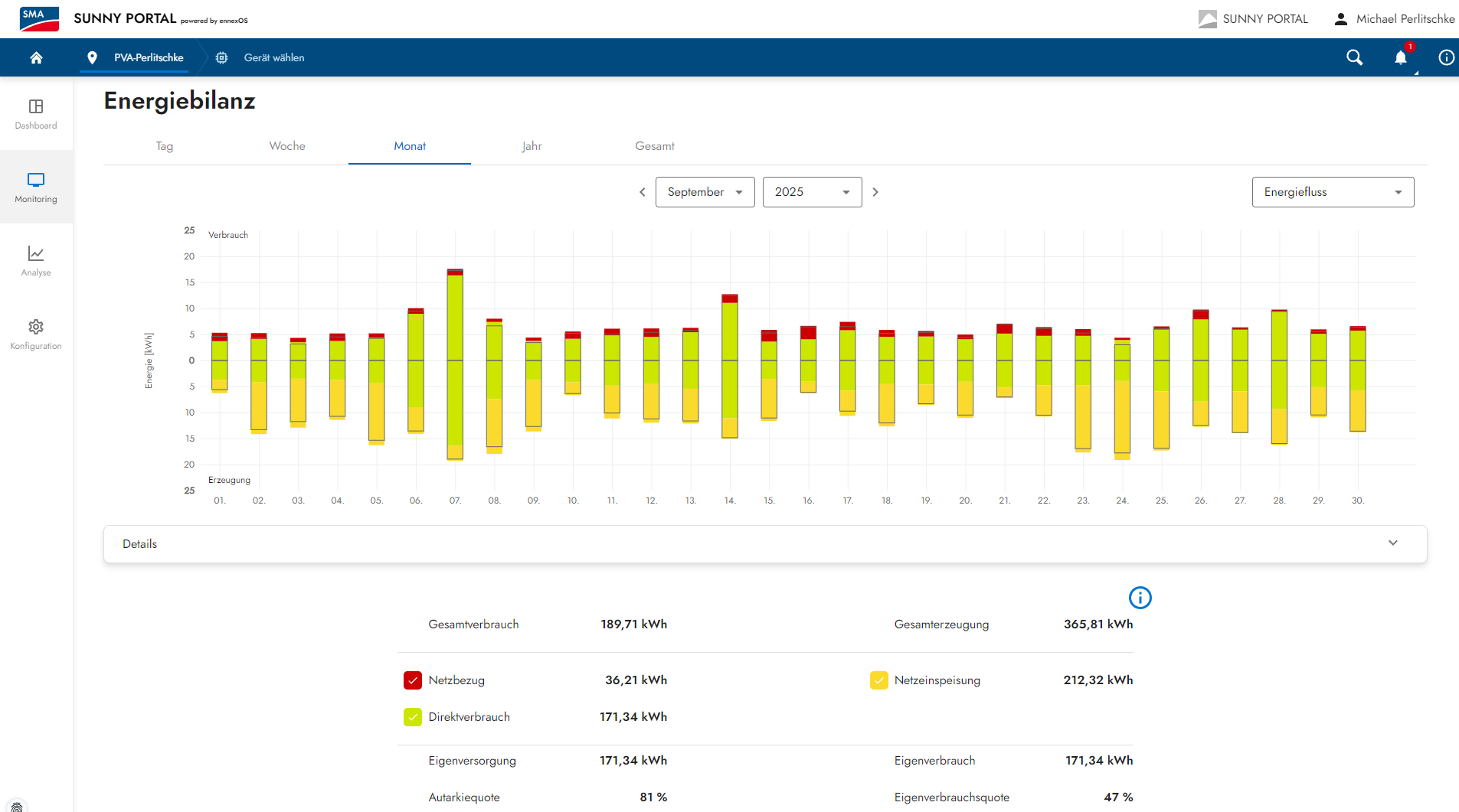 Hier die 4.2kwp Photovoltaik-Anlage auf dem Dach: Nun kommen wir aber wie jeden Monat zur kleinen 4,2kwp Dach PV Anlage und dem finalen September-Ertrag. Die Ertragserwartung für den September lag bei 324,77kwh und vom Dach kamen diesen September wegen der Sonnentage noch 365,81kwh. Das entspricht für diesen Monat ein Plus von 13% gegenüber der Ertragserwartung. Das ist zwar kein Spitzenwert für den September, aber immerhin ein zweistelliges Plus. Betriebswirtschaftlich zwar kein Feuerwerk, aber durchaus noch als solide zu betiteln: