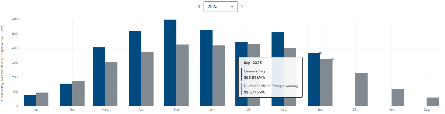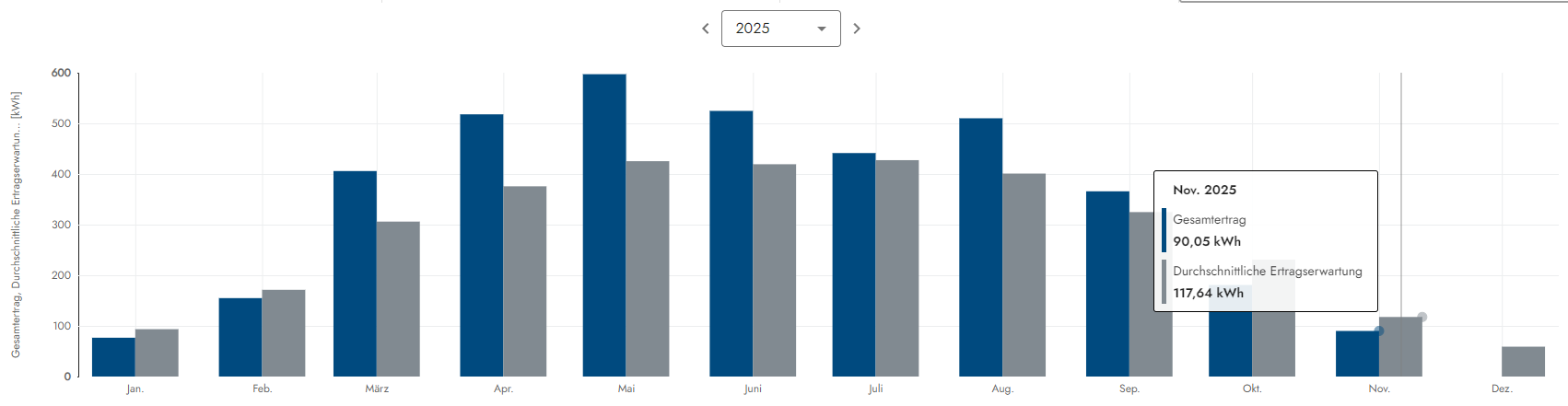 Der sechste Monat im 9ten Produktionsjahr legt nochmal eine Schippe nach. Von den Investitionskosten in Höhe von 6600 Euro resp. 7854 inkl. MwSt. für die Dach PV sind wir nicht mehr sonderlich weit entfernt. Im ersten Halbjahr 2026 wird die 6600 Euro Marke definitiv fallen und das Jahr drauf also irgendwann im 10/11 Produktionsjahr auch die 7854 Euro Invest-Grenze. Somit hat sich die Investition der PV-Anlage zu 100% armortisiert. Die Carportanlage welche ja jetzt kräftig dabei hilft die grosse PV-Anlage zu stützen kommt dann danach (schaetze mal, das wird im Frühjar 2026 sein) und danach dann die 3 Speicher (8,1kwh Kapazität) Systeme was ca. weitere 2 Jahre dauern wird. Alles läuft somit fast schon besser als geplant und das trotz um 23% gesunkender Strom-Bezugskosten durch den Wechsel von den Stadtwerken Kiel zu Octopus im Sep. 2024. Aber diese spielen durch die Speicher keine wirklich entscheidende Rolle, da sich immer mehr alles in Richtung Eigenverbrauch bewegt, was ja auch der Sinn einer PV-Anlage ist und die Wirtschaftlichkeit wie gut zu erkennen ist segnifikant pusht! Aber ob die Ergebnisse von den beiden Jahren zuvor erreicht werden oder sogar noch oben durchstossen werden ist derzeit ungewiss. Denn nun stehen die Ertragsschwachen Wintermonate in den Startlöchern. Schon der Oktober war immer schwach und wenn im 9ten Produktionsjahr etwas passiert, dann ab der zweiten Fabruar-Hälfte und insbesondere im März 2026. 800 Euro sind also durchaus noch erreichbar...