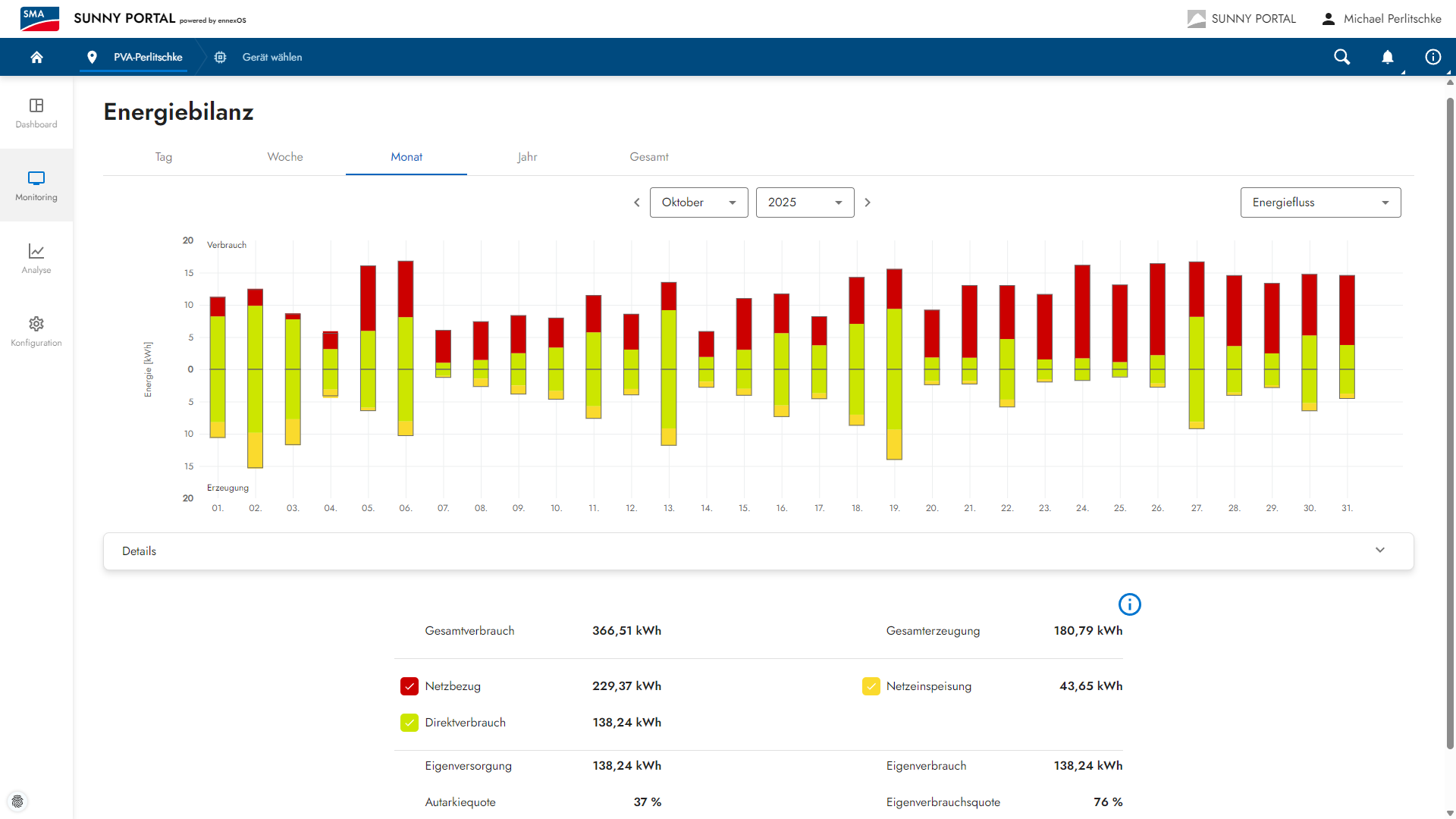 -Oktober: 5,14 Euro Gewinn durch Verkauf und Einsparung durch Eigenverbrauch 40,43 Euro: Summe 45,57 Euro