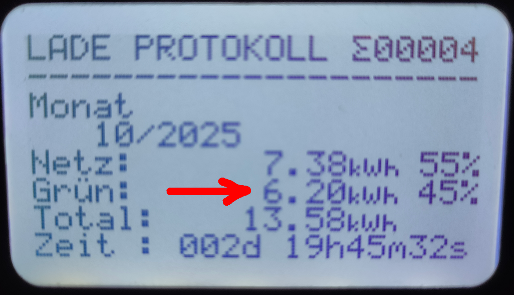 Nun aber zu den knallharten Daten mit der Carport-Anlage; Nachteinspeisungen also das Ergebnis des achten Monats im 9ten Betriebsjahr. Vom Dach kamen in diesem Oktober 2025 in Summe 90,05kwh. Der Stromzukauf von Octopus Energy lag für diesen Monat bei 493,77kwh (inkl. täglicher Heizung bei sehr vielen frostigen Tagen und Warmwasseraufbereitung der Wärmepumpe), welche bei 29,02 Cents pro Kilowattstunde meines Ökostrom-Tarifes ca. 143,29 Euro Strom Einkaufskosten bedeutet. Von den produzierten 90,05kwh habe ich 81,05kwh + 0,33kwh (Formel: 1. Eigenverbrauch + Netzeinspeisung - Gesamterzeugung =x! 2. Produktion Carport -x! = Eigenverbrauch Carport-Strom) von der Carport PV selbst verbraucht, was eine Ersparnis bei einem Kilowattstundenpreis von 29,02 Cents in Summe 23,62 Euro ergibt. Den Rest, also 9,33kwh an Strom (PV und Carport) wurden ins Netz abverkauft. Davon 87,5% also 8,16kwh zu 0,123 Cents und 1,17kwh zu 8,1 Cents was in Summe 1,00 Euro + 0,09 Euro = 1,09 Euro an Einnahmen durch den Stromverkauf bedeutet.