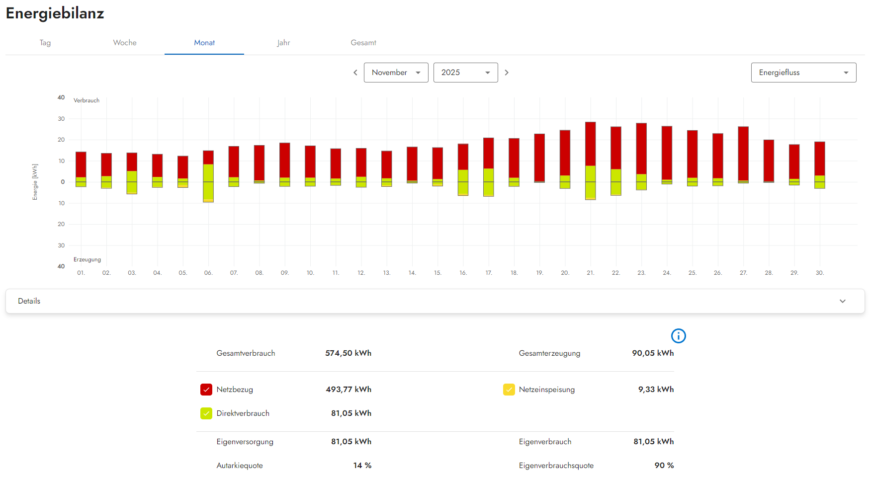 -November: 1,09 Euro Gewinn durch Verkauf und Einsparung durch Eigenverbrauch 23,62 Euro: Summe 24,71 Euro