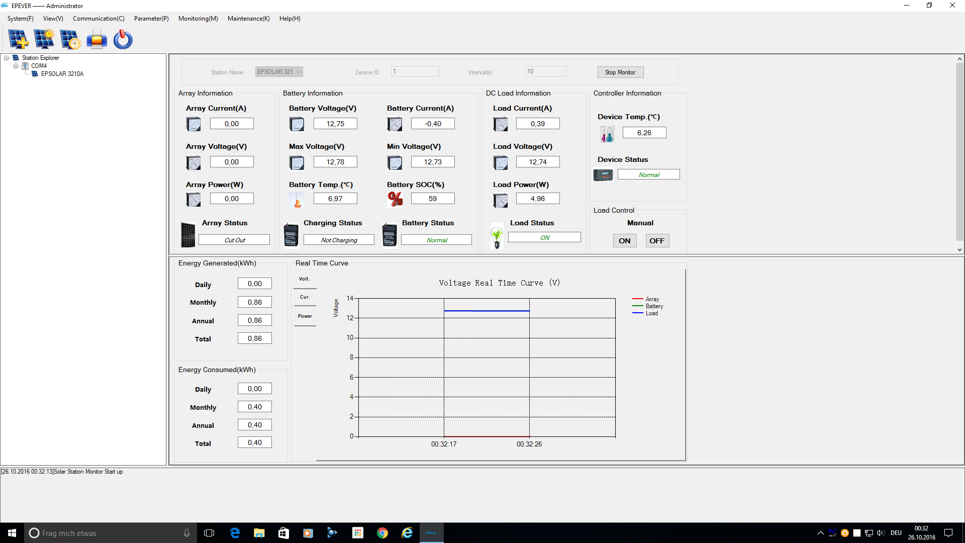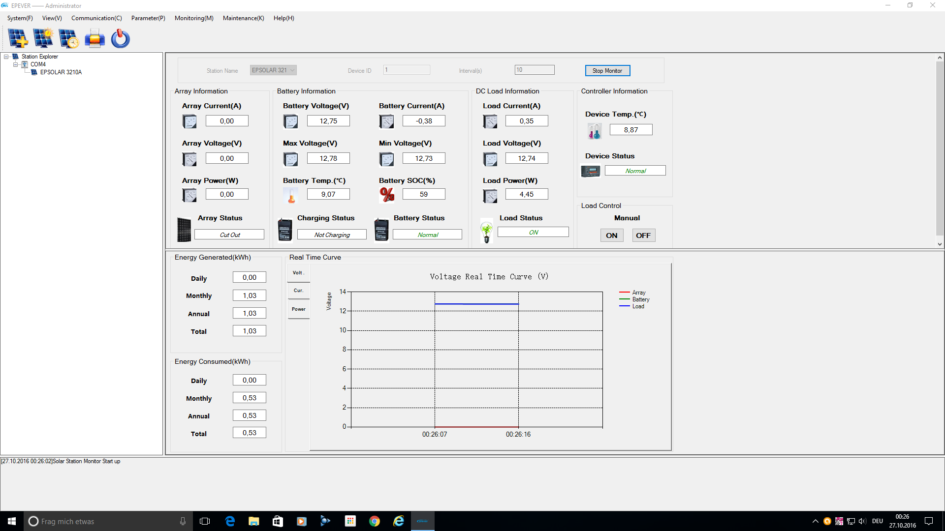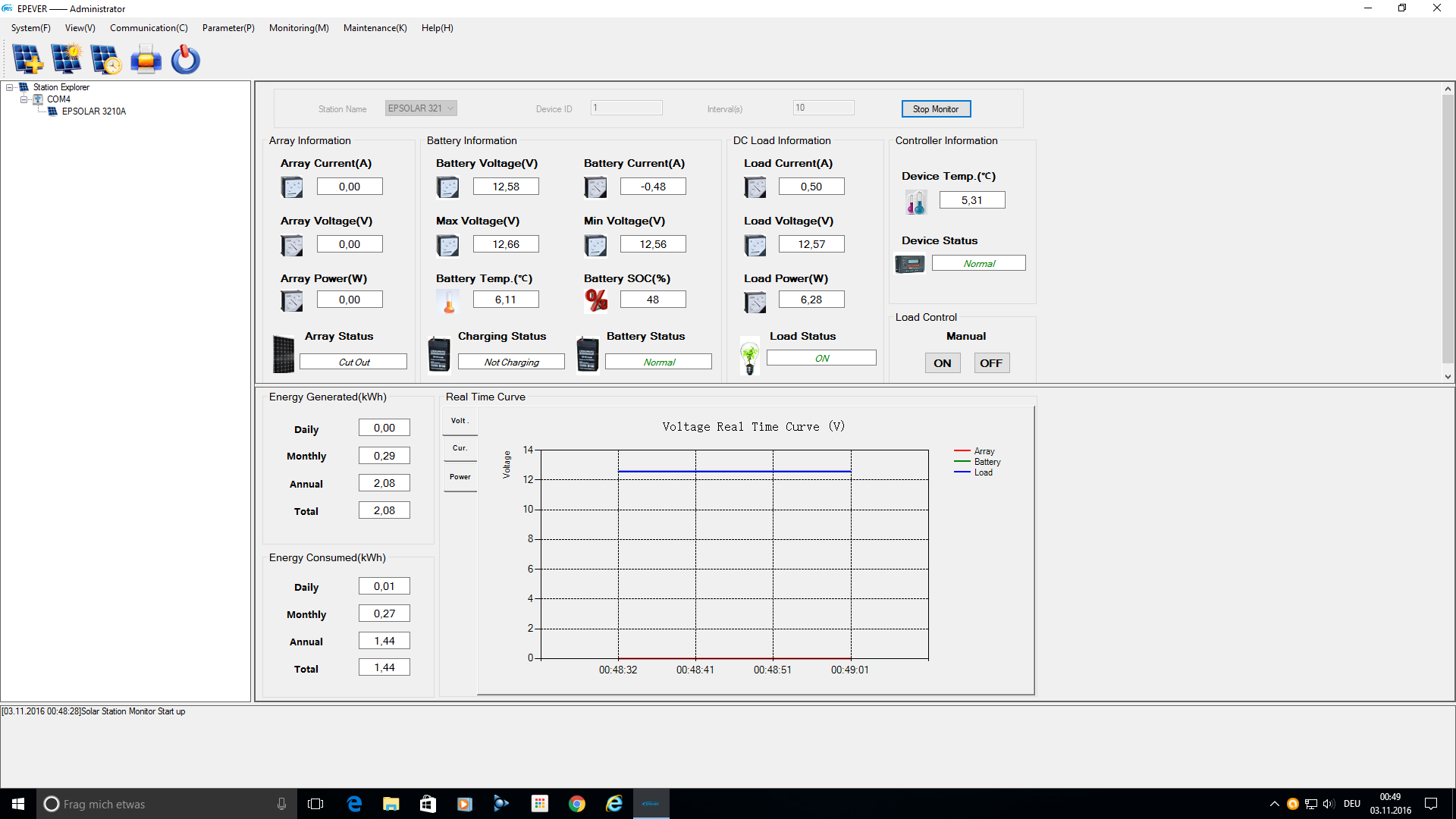 Uebrigens: Die SOC Anzeige ist beim EPSOLAR Tracer vollkommen ungeeignet und nutzt als 100% Basis die maximale Ladespannung. Das ist natuerlich kompletter Nonsens und Emails von EPSOLAR belegen auch das die SOC Funktionalitaet ( also die % Ladung des Akkus ) inkorrekt angezeigt wird. Hier muss man sich einfach angewoehnen die Akku-Spannung nach Einbruch der Dunkelheit echtes MASS der aktuellen Batterie-Ladung zu nutzen. Also 12.75 Volt = 100% VOLL