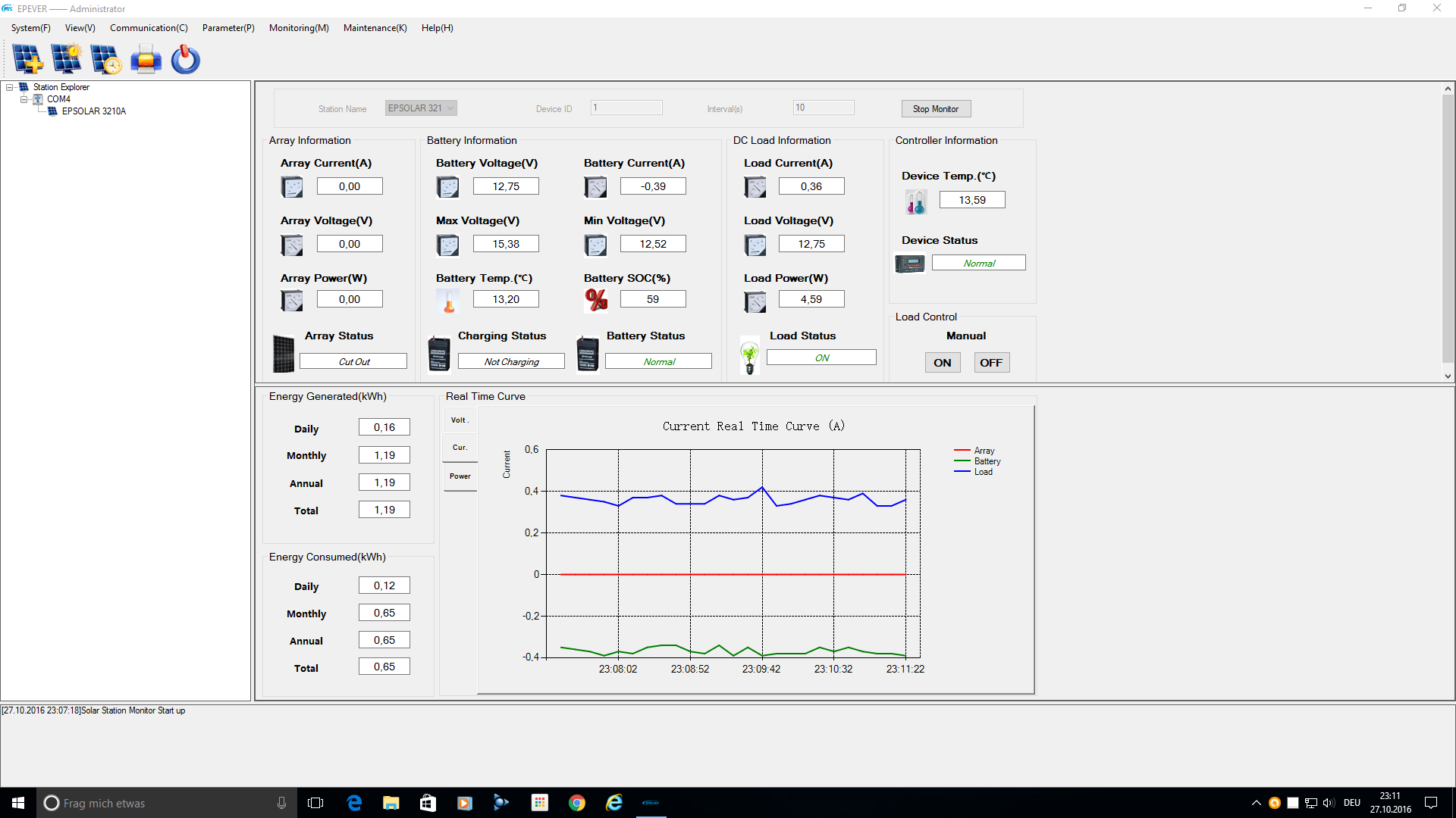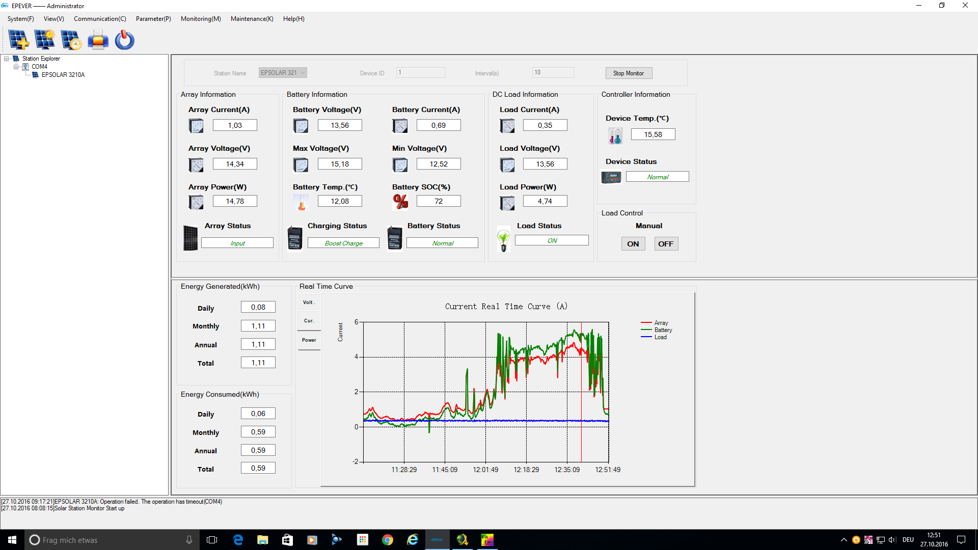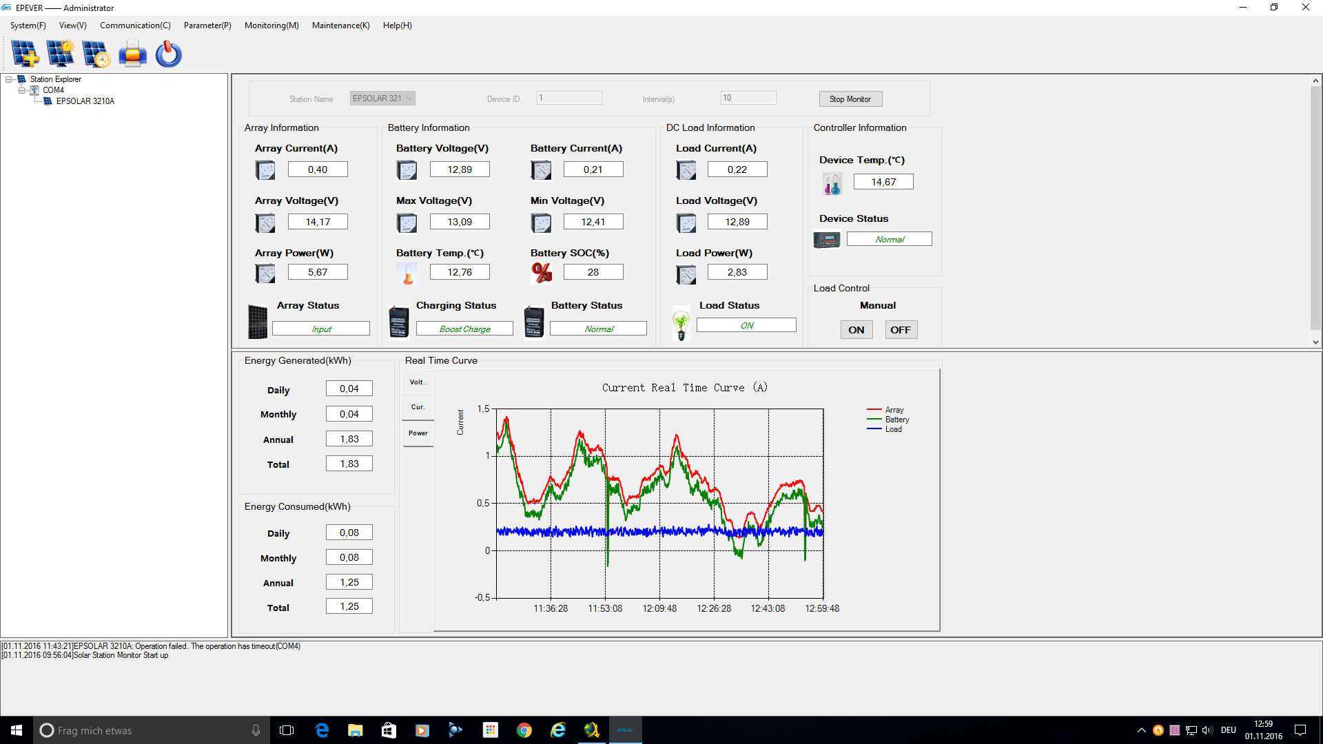 Tag 8 - Endlich....der erste halbwegs gute Tag wo mal die Sonne zu sehen war. Der Akku war dann auch entsprechend geladen als ich mir die Daten mittels Solar Station Monitors mittags bei Sonne welche seitlich eher unguenstig auf die Module traf anschaute. Der Ladestrom lag bei 3A und 0,35 Ampere fuer die Last (Kamera welche seit 1 Woche rund um die Uhr mit eingeschalteten IR-LEDs laeuft also mit maximaler Dauerlast). Um nun die Panels und den Lade-Regler etwas zu fordern bin ich in den Schuppen gewetzt und habe die Beleuchtung ( welche ich am Samstag auf 2 LED-Leisten erweitert hatte ) eingeschaltet und PENG steuerte der EPSOLAR Laderegler hoch auf ca. 85 Watt ( Spannung >20 Volt & >4 Ampere was bei 12 Volt ). Damit haette dann ein Strom von 7 Ampere erzeugt werden koennen von dem der Laderegler die aktiven Verbraucher (Last: Wobei die LEDs und mein DC-DC Board ca. 15 Volt erhielten und das DC-DC Board am Ausgang 12 Volt fuer die Kamera machte) mit >2 Ampere bediente und 3.5 Ampere in den Akku pumpte.