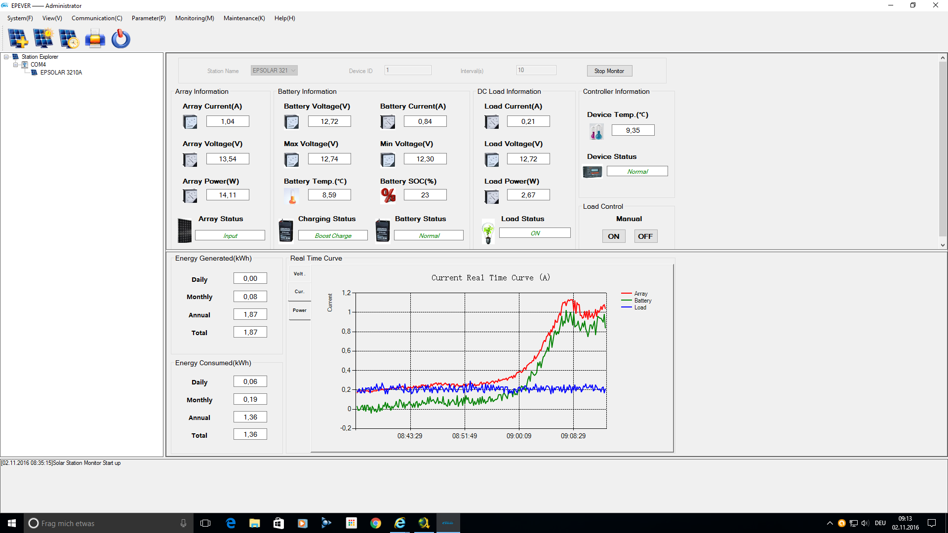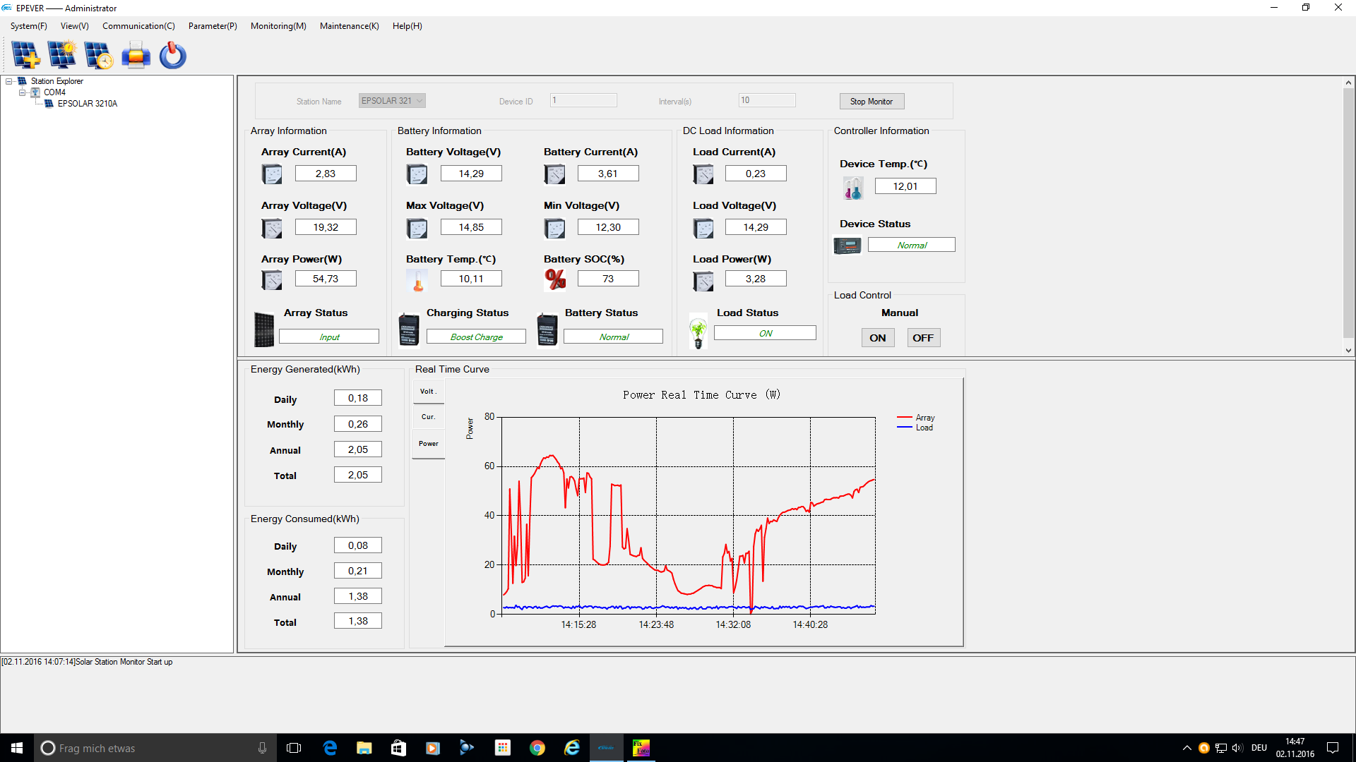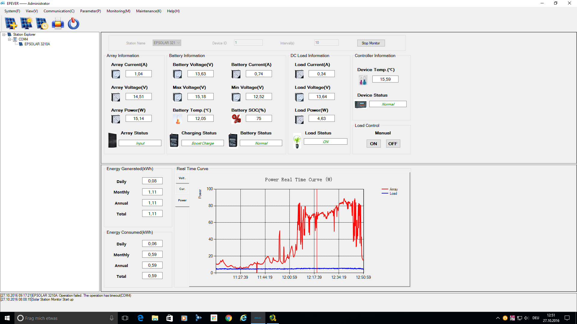Tag 8 - Endlich....der erste halbwegs gute Tag wo mal die Sonne zu sehen war. Der Akku war dann auch entsprechend geladen als ich mir die Daten mittels Solar Station Monitors mittags bei Sonne welche seitlich eher unguenstig auf die Module traf anschaute. Der Ladestrom lag bei 3A und 0,35 Ampere fuer die Last (Kamera welche seit 1 Woche rund um die Uhr mit eingeschalteten IR-LEDs laeuft also mit maximaler Dauerlast). Um nun die Panels und den Lade-Regler etwas zu fordern bin ich in den Schuppen gewetzt und habe die Beleuchtung ( welche ich am Samstag auf 2 LED-Leisten erweitert hatte ) eingeschaltet und PENG steuerte der EPSOLAR Laderegler hoch auf ca. 85 Watt ( Spannung >20 Volt & >4 Ampere was bei 12 Volt ). Damit haette dann ein Strom von 7 Ampere erzeugt werden koennen von dem der Laderegler die aktiven Verbraucher (Last: Wobei die LEDs und mein DC-DC Board ca. 15 Volt erhielten und das DC-DC Board am Ausgang 12 Volt fuer die Kamera machte) mit >2 Ampere bediente und 3.5 Ampere in den Akku pumpte.