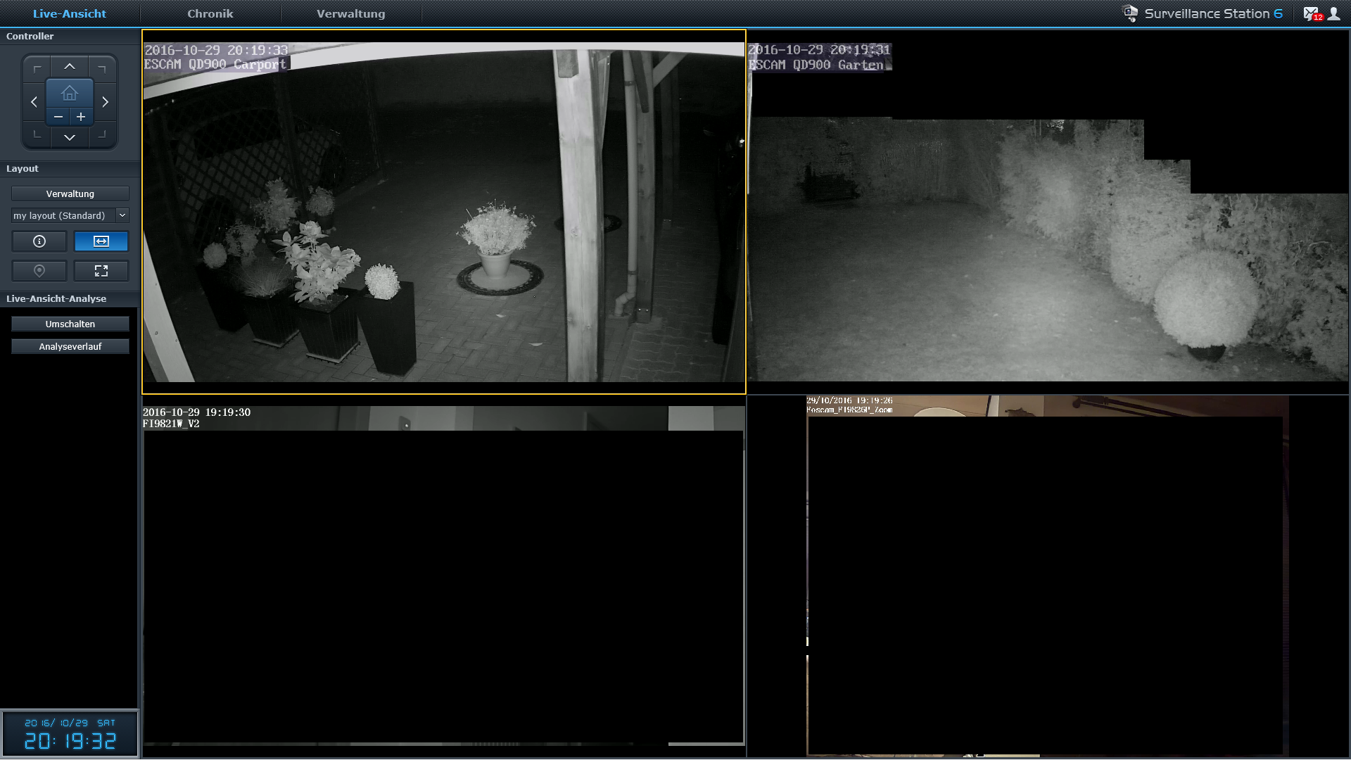 Auch war es gut das ich die Einstellungen am Flutlicht schon vorab in aller Ruhe vorgenommen hatte, so brauchte ich die Beleuchtung nur anschrauben; verkabeln; Sicherung in den Plus-Strang klemmen und alles funktionierte sofort wie es soll. Auch die QD900 war sofort einsatzbereit, denn diese habe ich auch vorab komplett konfiguriert und in meine Synology Surveillance-Station eingebunden.