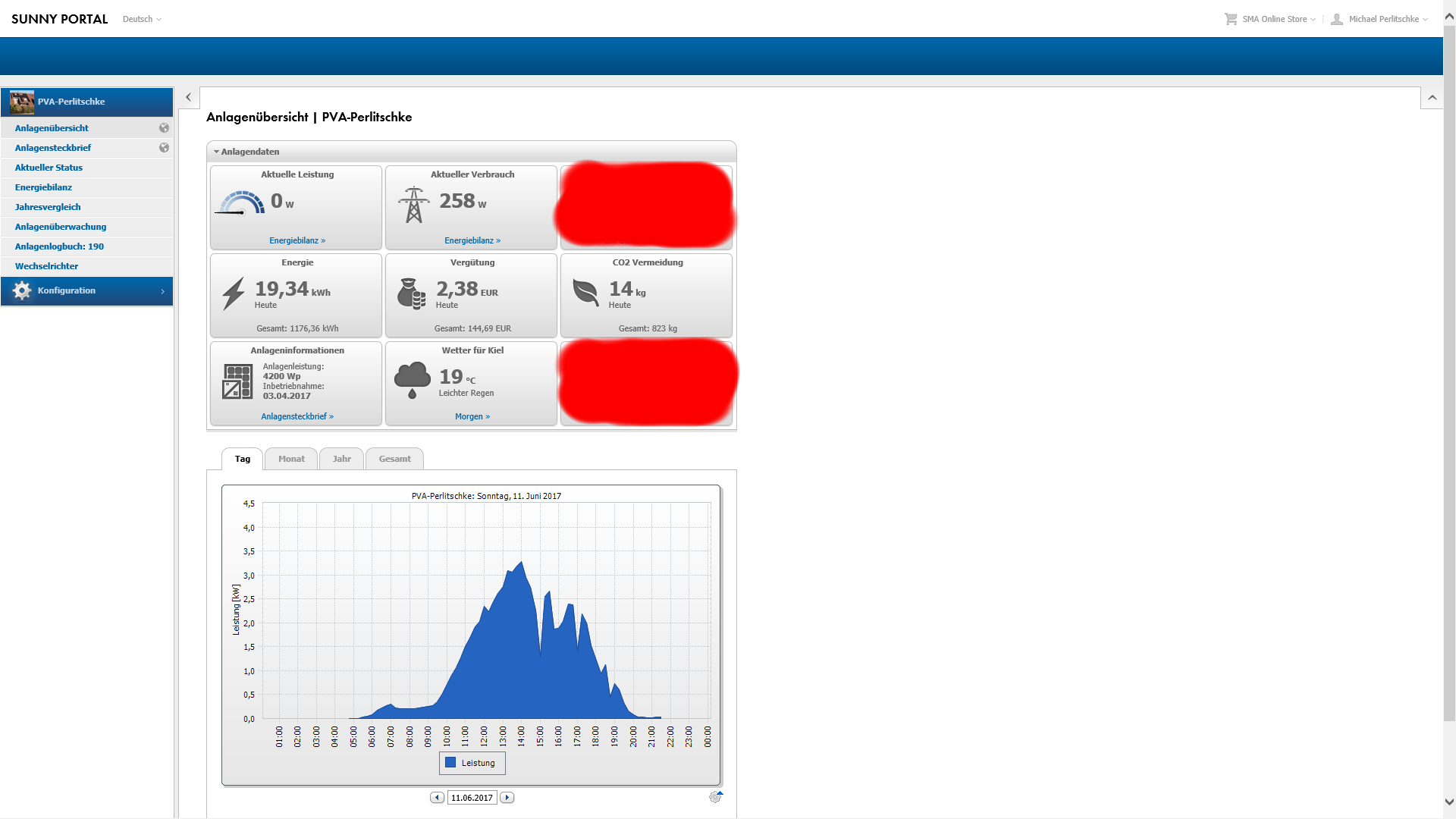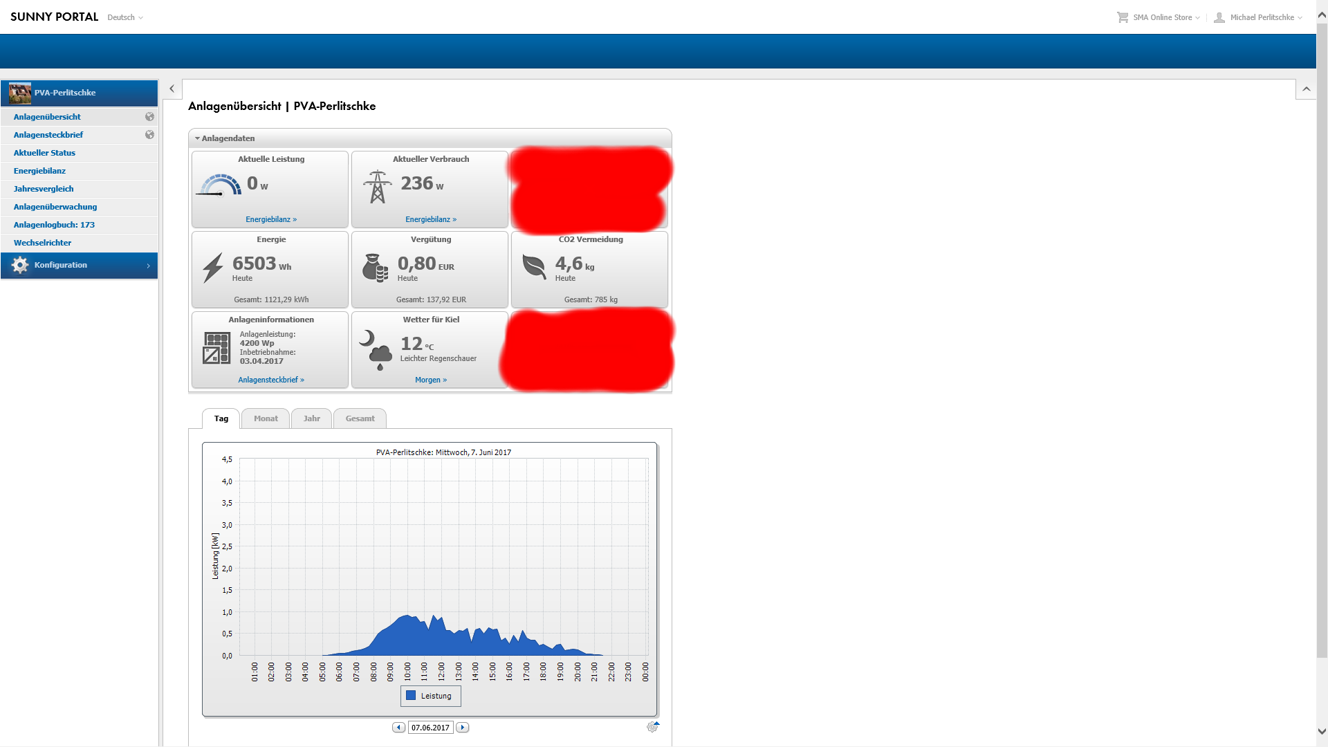 Auch die grosse 4200Watt Dach-Solaranlage hat endlich wieder ueber dem prognostizierten 14kwh Tages-Durchschnitt fuer den Monat Juni rangeklotzt und in Summe 18,29kwh produziert.Davon habe ich selbst 4kwh verbraten und 14,23kwh (1,75 Euro) ins Netz gepumpt. Endlich wieder ein Ertragsseitig halbwegs brauchbarer Tag und der Netzbezug lag bei 2.34kwh (70 Cents). Die Autarkiequote darf man mit 63% als sehr gut einstufen und die Eigenverbrauchsquote durch die hohe Einspeisung duempelte bei 22% herum.