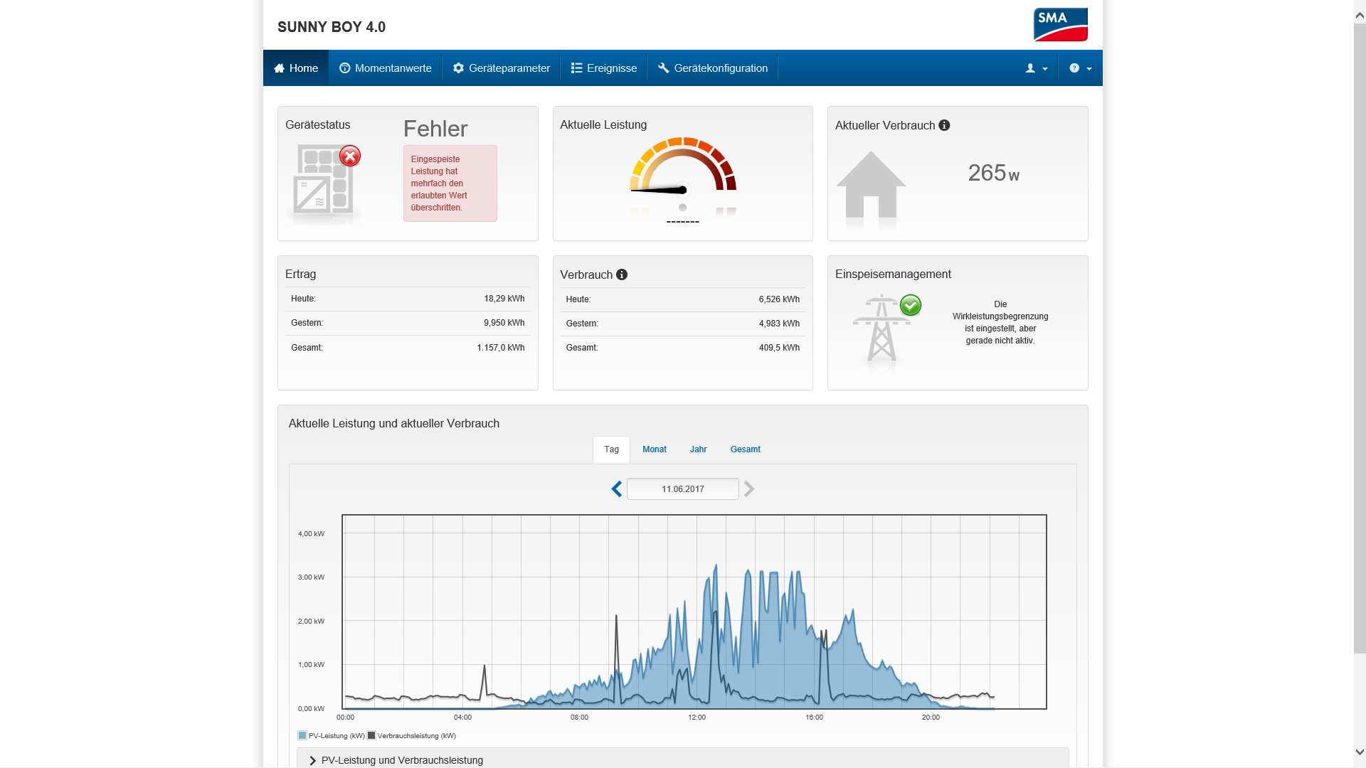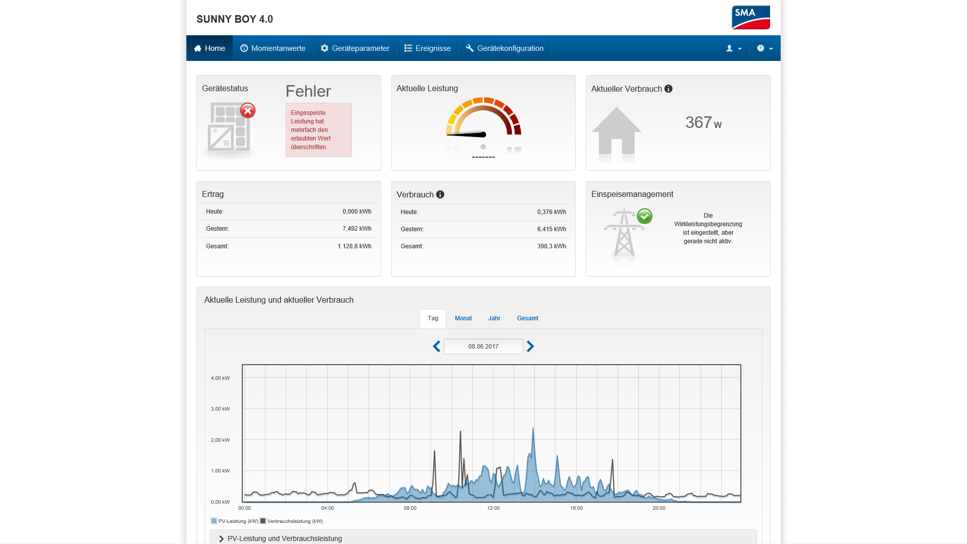 Uebrigens, heute habe ich meinem Solateur eine Email geschickt, wegen des nach wie vor vorhandenen Anzeigefehlers ( ROTE LED am Wechselrichter mit dem EINGESPEISSTE LEISTUNG WURDE UEBERSCHRITTEN ). Denn seit dem 5 Mai 2017 gibt es eine neue Firmware wo ich im PDF herausgelesen habe, das da einziges in Kombination SUNNY BOY 4.0 in Kombination mit dem ENERGY-METER entwanzt wurde. Ich selbst kann die Firmware nicht einspielen, da das nur dem Installateur moeglich ist. Auch muss nach dem Einspielen der neusten Firmware V 1.3.4.R ein paar Parameter angepasst werden. Auch das kann nur der Installateur und nicht der Endkunde...bin mal gespannt ob und wie die Installations-Firma reagiert und handelt und auch ob der Anzeige-Fehler dann erledigt ist. Der Wechselrichter arbeitet absolut korrekt, aber der Fehler also ROTE ALARM-LED nervt. Zusaetzlich wird auch das Anlagen-Fehlerlogbuch dichtgebombt und zugemuellt wegen dieses doofen Fehlers, der faktisch keiner ist! Mal schauen ob die neue Firmware und Parameter-Anpassungen das kosmetische Problem beheben...