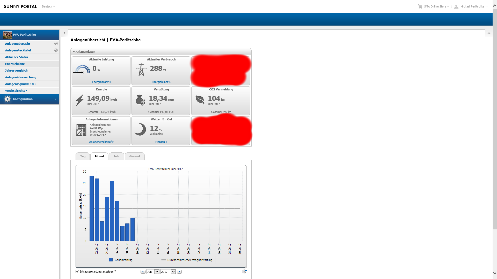 Wie schon vermutet, ist es nun nur noch die Frage, wie weit wir ueber die Ertragserwartung hinausschiessen werden. 100kwh mehr als geplant erachte ich schon jetzt als nicht wirklich unrealistisch. Warum sind mir die Ueberschuesse so wichtig resp. interessant fuer mich, werden sich nun einige hier denken?! Ganz einfach: Alles was in den produktionsstarken Monaten zu viel produziert wird kann in den schlechten Monaten als rechnerischen Kompensations-Puffer -so es Wetterseitig ganz boese kommt- easy herhalten. Hinzu kommt das in den Produktionsstarken Monaten APRIL bis SEPTEMBER das meiste Geld ueber die Einspeisung reinkommt. Dieses Geld ist dann der Puffer fuer den in schlechten Monate immer weiter steigenden Stromzukauf. D.h. je mehr ich in den guten Tagen erwirtschafte, desto laenger kann ich Umlagengesteuert weiterhin kostenlos Strom einkaufen und meine Stromrechnung auf 0 Euro halten. Also das was ich nun seit der Inbetriebnahme der Anlage nutze -also 0 Euro fuer die Stromrechnung- auch in die Zeit des regulaeren Verlustes reinbuttern. Im Idealfall also bis Ende des Jahres eine Stromrechnung von 0 Euro durch die zuvor generierten Einnahmen. Das wird natuerlich wegen der geringen Verguetung von 12,3 Cents pro Kilowattstunde vs. 30 Cents fuer den Zukauf nicht funktionieren, aber was funktionieren wird, ist das ich den Termin an dem echte Stromkosten auflaufen moeglichst weit nach hinten schiebe. Und da hilft mir jedes jetzt produzierte und verkaufte Kilowatt insbesondere wenn man in der Ertraghsreichen Zeit wie letzten Monat geschehen >38% mehr als erwartet produziert ist das schon segnifikant. Beispiel: Im Mai waren es ungeplante 156kwh extra. Davon kann ich mir fuer 30 Cents regulaer 64kwh Strom regulaer kaufen resp. 10 Tage komplett ueberbruecken (ohne PV-Anlage). Mit paralleler reduzierter PV-Produktion natuerlich entsprechend laenger. 15-20 Tage Exta sind sicherlich nicht unrealistisch. Also 2-3 Monate mit aehnlichen Extra-Ueberschuessen wurden mir den kompletten Stromverbrauch fuer 1 Monat sicherstellen. Hinzu kommen noch die regulaeren Einnahmen aus den Ertragserwartungen (das sind ohne diese produzierten Ueberschuesse seit dem 3 April immerhin 1000kwh). Somit bin ich in der Lage zusaetzlich nochmal 410kwh regulaer und kostenlos einkaufen zu koennen resp. 50 Tage (ohne die dann anfallenden Ertraege der PV-Anlage) ueber die Runden zu kommen. Somit waere es durchaus im Rahmen des moeglichen das ist zwisschen dem 3 April bis 31 Dezember keinerlei effektiven Stromkosten produziere und alles an benoetigtem STROM seit dem 3 April fuer mich allein durch die PV-Anlage ( Ertragserwartung resp. abverkauften Strom plus die erzeugten ungeplanten Ueberschuesse ) erzeugt wurde.