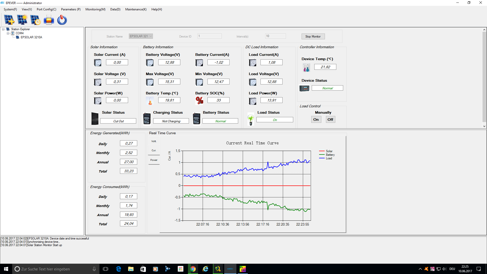 Tag 234 (Samstag, der 10.06.2017)- Wie gestern schon angekuendigt hat sich das Wetter heute etwas verbessert. Es war ein staendiger Wechsel zwischen Sonne und Wolken und erst gegen 17/18 Uhr zog es wieder komplett zu. Die Insel-Anlage hat die notwenigen 270Wh bis Mittags problemlos und flott eingefahren und sich dann in potentiell interessanten und Ertragreichen Zeit mit der ERHALTUNGS-Ladung begnuegt. Wenn schon die letzten beide Horror-Tage kein Problem war, war dieser halbwegs brauchbare Tag erst recht ein Kinderspiel...
