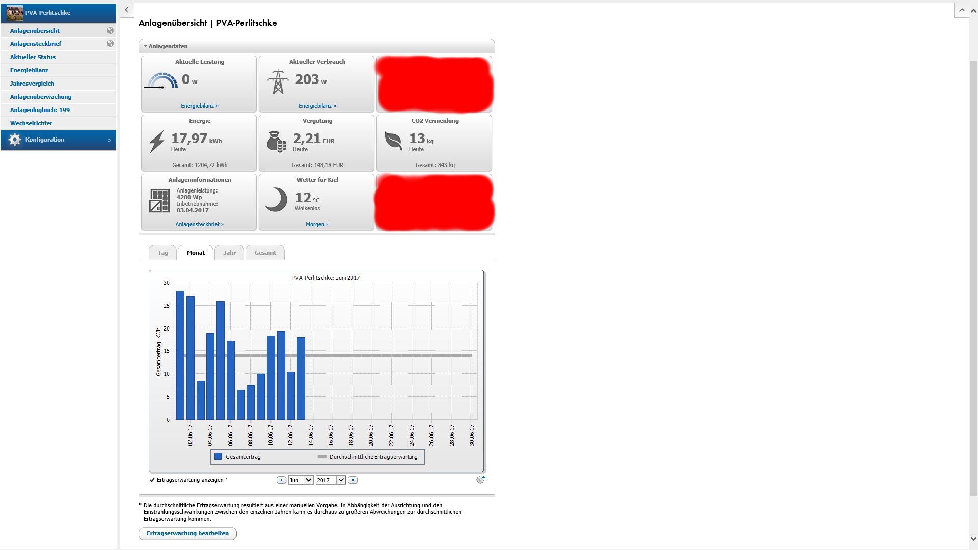 Mit dem heutigen Tag (13 Juni) wurde nun auch die Ertragserwartung von 50% mit 215kwh durchbrochen. Somit muessen noch 204kwh bis Ende Juni produziert werden um das Ertragsziel zu erreichen. Ich bin sehr optimistisch und zuversichtlich das sich dieses Ziel problemlos erreichen laesst (so es nun nicht 14 Tage am Stueck wie aus Kuebeln regnen wird). Die Frage ist also nicht ob man das Ziel erreicht, sondern wie weit man drueber schiessen wird. Ein so sensationelles Ergebnis wie im Mai-Monat zuvor werden wir im Juni keinesfalls erleben, aber ich lass mich da auch gerne ueberraschen, denn wir wissen ja das 25-28kwh bei einem komplett Sonnigen Tag problemlos moeglich ist...