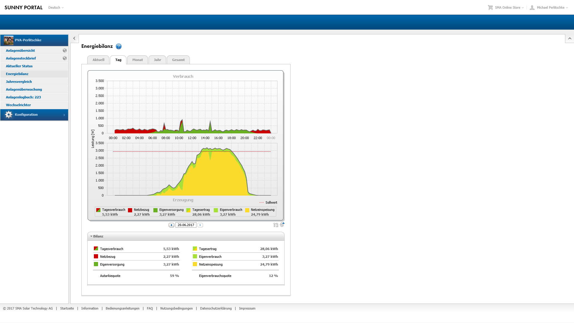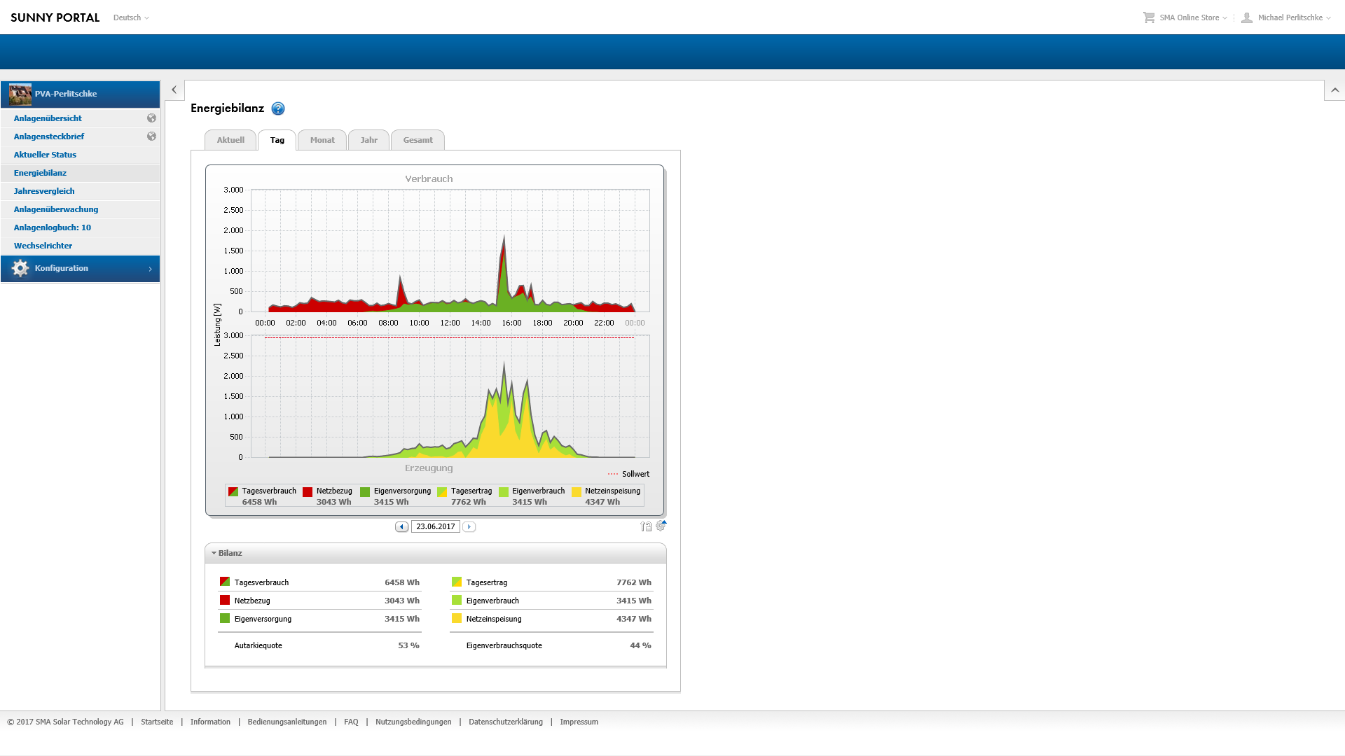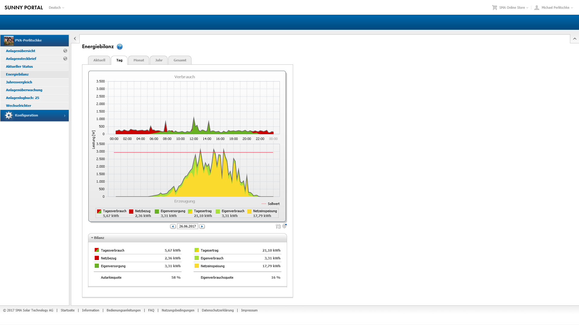 Auch die grosse 4,2kwp Dachanlage hat Vollgas gegeben und in Summe 26kwh (26000 Watt) vom Dach geholt. Davon habe ich 3,59kwh selbst verbraucht und die restlichen 22,36kwh ins Netz resp. zu meinen Nachbarn geschaufelt. Der Zukauf lag bei 2,5kwh und die Autarkiequote bei sehr guten 59%. Also alles in allem ein fetter Ueberschuss der wieder mal richtig Freude aufkommen liess und den Monatsertrag nach oben auf nun 290kwh schob (412kwh sollten bis Ende Juni in Sack kommen, was wir aber deutlich frueher schaffen werden).