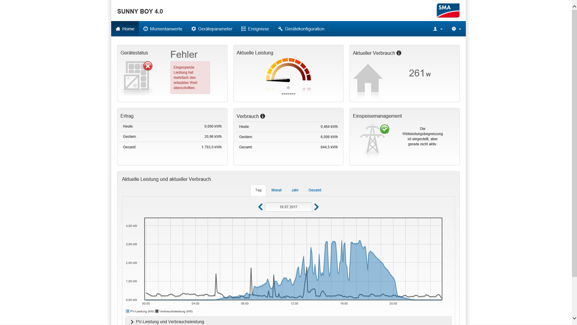 Ferner hat mein Solateur (Firma die mir die Anlage installiert hat) leichte Aenderungen an der Anlagenkonfiguration vorgenommen um das Problem mit dem Phantom-Fehler "Eingespeisste Leistung hat mehrfach den erlaubten Wert ueberschritten" zu beseitigen. Da wurde die Konfiguration von Prozent aus Watt umgestellt (500.000 Watt raufgesetzt um dann wieder auf 2940 Watt eingestellt zu werden) und auch am Soft-Access Point gab es eine Veraenderung. Das hat natuerlich zur Folge das alle Tagesertraege als Graph seit der letzten Konfigurations-Aenderung (28 April 2017) nicht mehr sauber skaliert angezeigt werden. Die Daten sind aber im Sunny-Portal noch vorhanden, aber die Graphen beziehen sich nun auf 500.000 Watt und somit so klein, dass diese nicht mehr zu erkennen sind. Nun bin ich mal gespannt ob ab heute der Anzeige-Fehler (mehr ist es ja nicht, denn die Anlage arbeitet korrekt und streng nach dem Gesetz) und das Leuchten der ROTEN-LED beseitigt ist. Mittlerweile habe ich auch rausgefunden das dieser Fehler immer nur dann auftritt, wenn wenig Strom von den Paneln kommen und der Eigenverbrauch im Haus ueber der maximal anliegenden Panelleistung operiert....sehr komisch, aber mein Solateur ist da zusammen mit SMA am Ball und ich bin ich nicht der einzige mit diesem merkwuerdigen Anzeigefehler...
