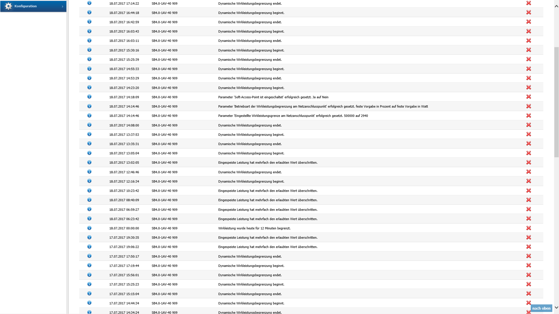 Ferner hat heute mein Solateur und SMA per Fernwartung erneut an der Anlage Konfiguriert, da der Anzeigefehler Nachts inform einer ROTEN WARN-LED nach wie vor vorhanden ist und die Konfiguration von gestern nichts brachte. Man sieht es im Screenshot zwischen 14 & 15 Uhr das erneut an der Anlage und dessen Konfiguration gearbeitet wurde. Ich nehme an, dass nun Stueck fuer Stueck resp. Tag fuer Tag ein paar Einstellungen durchprobiert werden um den Fehler ( "Eingespeiste Leistung hat mehrfach den erlaubten Wert überschritten." ) der keiner ist aber von der Anlage als solcher interpretiert endlich vom Tisch zu bekommen. Mal schauen was der morgige Tag bringt, und ob die neue Konfiguration das Warn Anzeigen-Problem loest...
