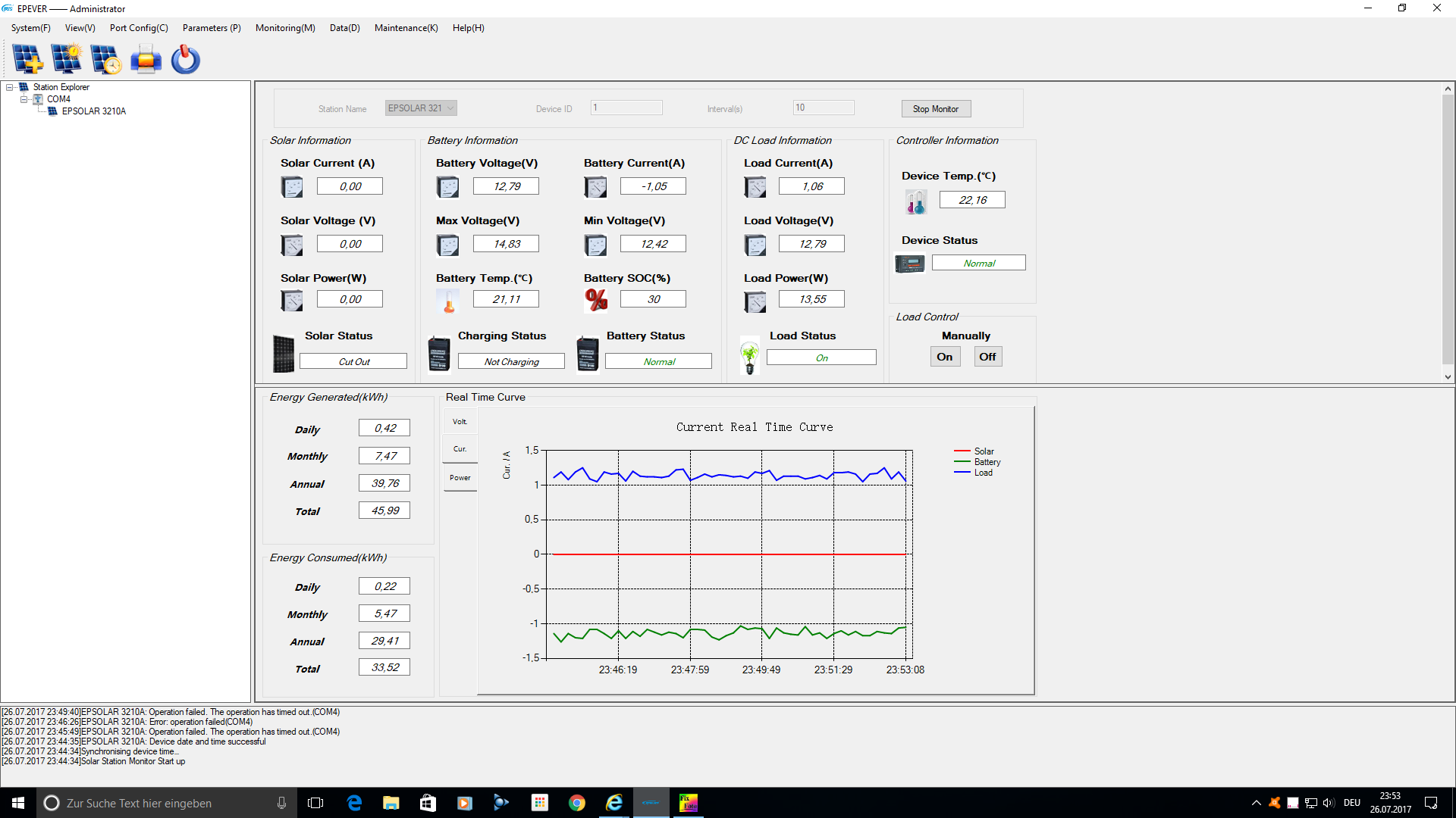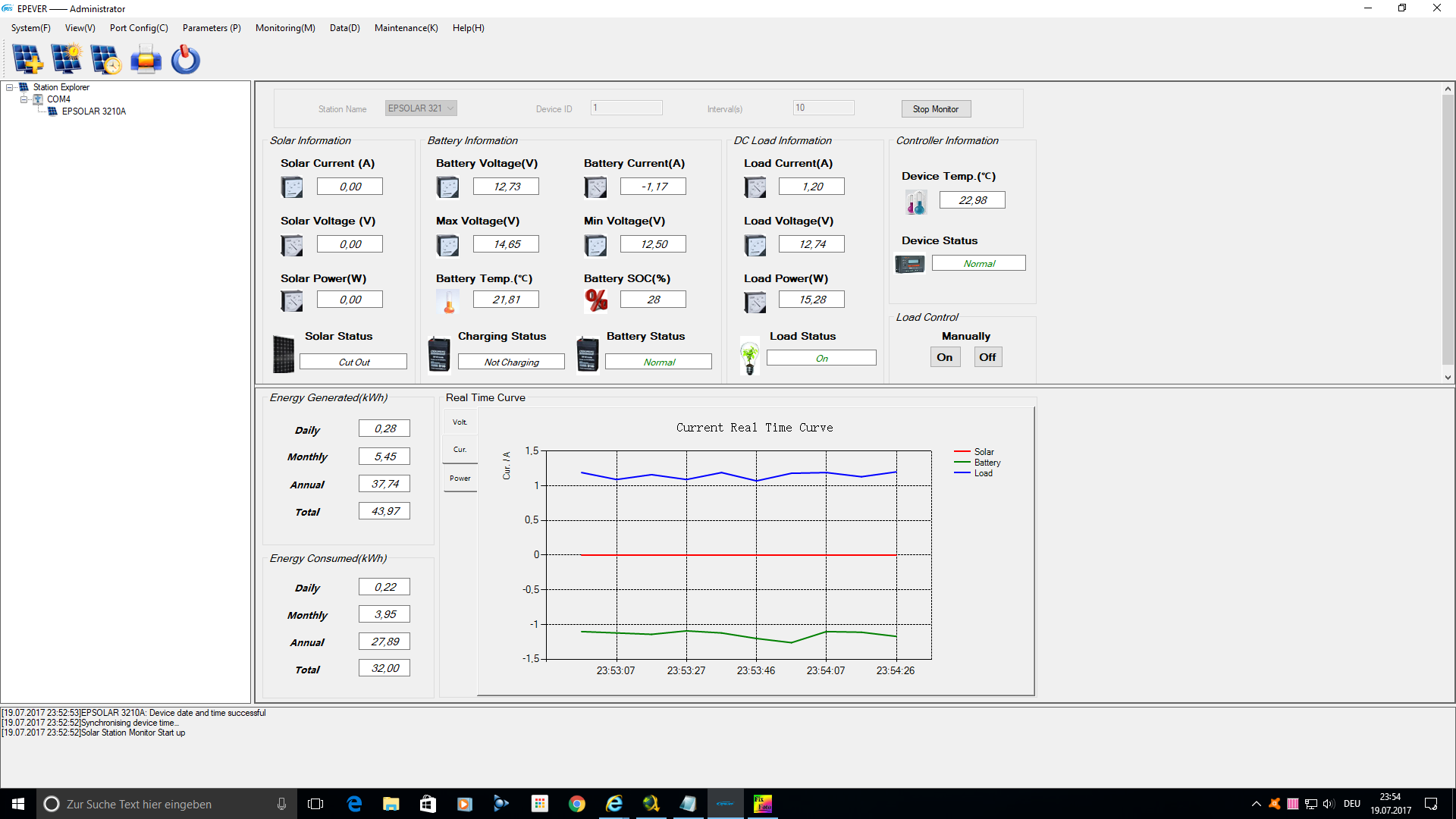 Tag 275 (Samstag, der 22.07.2017)- Das heutige Wetter war wie gestern schon vorhergesagt unterirdisch. Den ganzen Tag lagen dicke schwere Wolken im Himmel und es war dadurch vergleichsweise dunkel draussen. Auch gab es hin & wieder ein bisschen Regen, aber zum Glueck nicht viel und lange. Was hat die Insel-Solaranlage aus dieser Situation gemacht? Was diese seit dem Maerz jeden Tag macht und zwar STROM PRODUZIEREN----STROM PRODUZIEREN---UND NOCH MEHR STROM PRODUZIEREN. Keine grossen Mengen an Strom in kuerzer Zeit, aber kontinuierlich immer ein bisschen. Dieses "BISSCHEN" laeppert sich irgendwann, sodass die Inselanlage selbst unter diesen Umstaenden die notwenigen 280Wh zusammen bekam und die Akkus absolut problemlos bis auf 100% fuellen konnte. Ganz grossen Kino was die kleine Anlage selbst bei einem solchen Dreckswetter zu produzieren imstande ist.