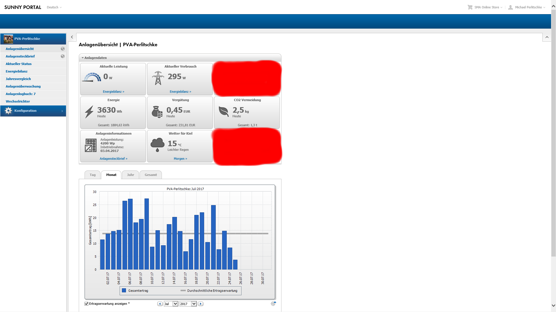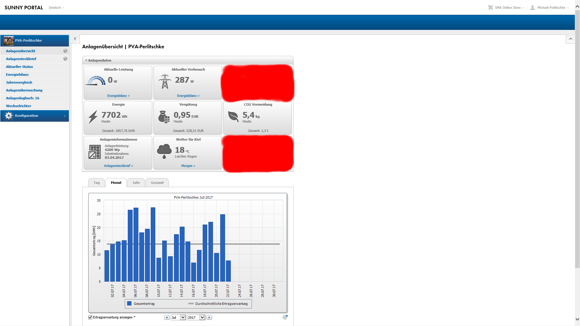 Nach nun 23 Tagen wurden 378kwh produziert und es fehlen noch 49,25kwh um das July-Ertragsziel in den kommenden 7 Tagen zu erreichen. Morgen werden sicherlich 15kwh davon reinkommen; uebermorgen wird wieder ganz uebel mit vielleicht 8kwh und ueberuebermorgen stehen wieder 15-20kwh auf dem Programm. So alles klappt ist das Monats-Ziel am Donnerstag den 27 July erreicht und alles was dann die letzten 4 Tage reinkommen wuerde, waere der Extra-Sonnen BONUS fuer die solare Kriegskasse! In Summe hat die Dachanlage seit dem 3 April bis heute den 23 July 1872,42kwh vom Dach geholt. Nicht uebel, wenn man bedenkt das es sich nur um eine sehr kleine Anlage handelt und mein Jahresstrombedarf bei ca. 2400kwh liegt. Die Anlage ist also von meinem Solarteur wie es sich gehoert leicht ueberdimensioniert worden. Eine Photovoltaikanlage sollte immer ca. 30% groesser dimensioniert werden im Vergleich zum aktuellen Strombedarf. Also wenn 2400kwh gebraucht werden, sollte die Anlage mindestens 3120kwh liefern. In meinem Fall wurden 2600kwh zugrunde gelegt, aber letztes Jahr habe ich den Verbrauch durch Optimierungen wie zum Beispiel den konsequenten Wechsel zu LED Leuchtmitteln optimiert. Also wird mein Stromverbrauch ohne Anlage unter dem wert von 2016 (dem Jahr der Berechnungsgrundlage) liegen. Ich schaetze mal 100-200kwh niedriger. Genau weiss ich das erst am 3 April 2018, denn mit der Photovoltakanlage habe ich nebenbei auch alle Energiestroeme genausten im Blick...