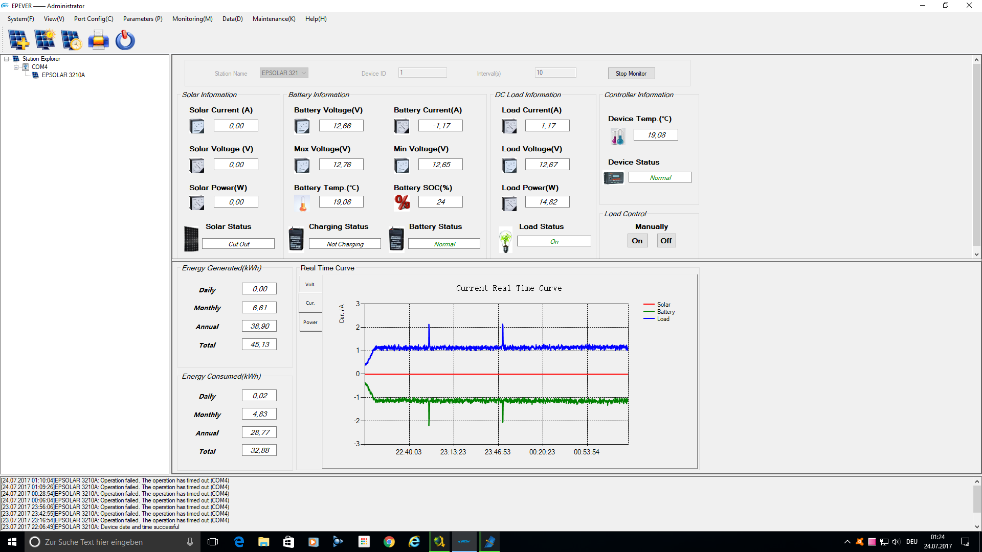 Tag 276 (Sonntag, der 23.07.2017)- Das Wetter heute war bis 15:30 Uhr auch keine Freude. Dicke fette Wolken und schlecht Wetter standen auf dem Programm. Ab 15:30 Uhr verzogen sich die Wolken und es kam doch tatsaechlich die Sonne raus. Der Insel-Solaranlage war das aber alles egal, diese hatte die 280Wh bis 14 Uhr zusammen und die beiden Akkus voll geladen. Unten im Screenshot kann man uebrigens wunderbar sehen wann die beiden Kameras auf den Nachtbetrieb umschalten (die benoetigte Energiemenge verdoppelt sich durch diesen IR-Modus) und auch wie das Flutlicht zweimal aktiviert wurde. Das passiert immer dann wenn auf dem Buergersteig (Strasse) mehrere Personen laufen oder Autos mit schlecht einstellter Beleuchtung von rechts durch die Kurve fahren und das KFZ-Licht den Sensor voll trifft. Fahrzeuge mit schlecht einstellter Beleuchtung sind aber selten, pro Woche aktiviert sich das Flutlicht durch Autos ca. 6 mal. Das es auch von Fussgaenger-Gruppen >2Personen ausgeloest wird, finde ich auch sehr gut. Somit ist sichergestellt das sobald jemand ueber den Zaun steigt, das Flutlicht umgehend aktiviert wird und die Kameras resp. die Synology Surveillance-Station umgehend in den Aufnahmemodus schaltet. Perfekt!
